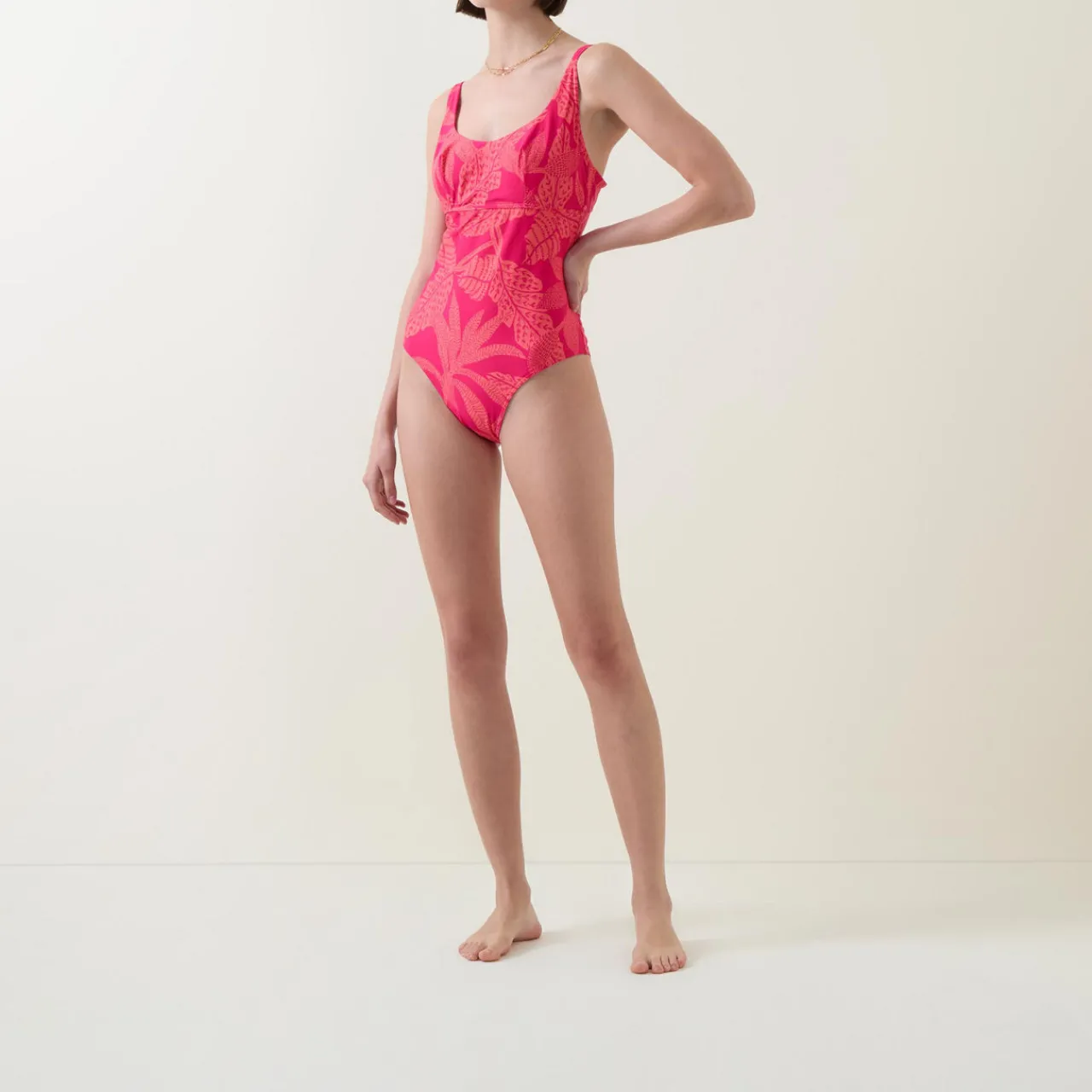 - Straight scoop neckline, adjustable straps, inner structure with under wiring, hollow back, moderate coverage, rose print