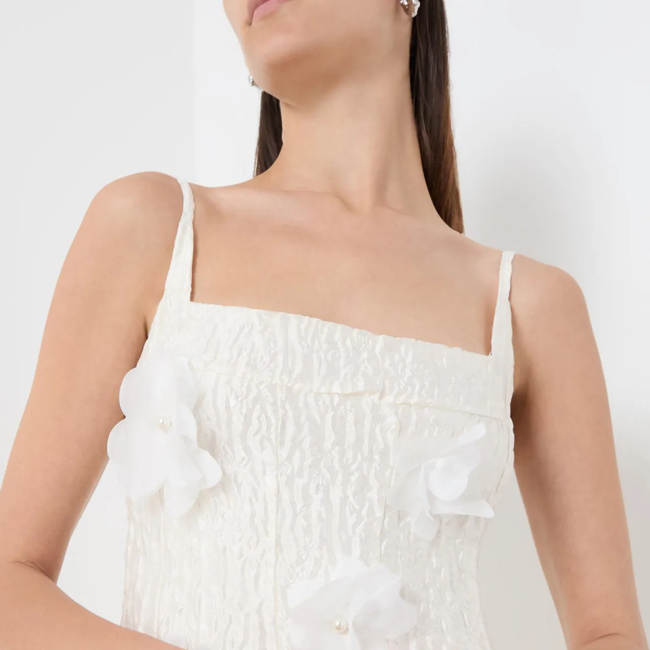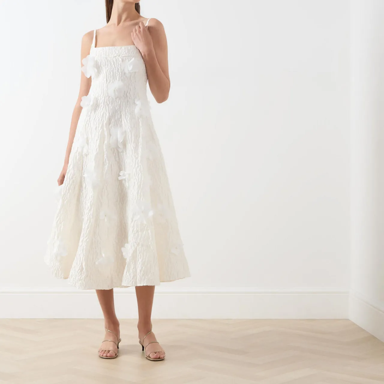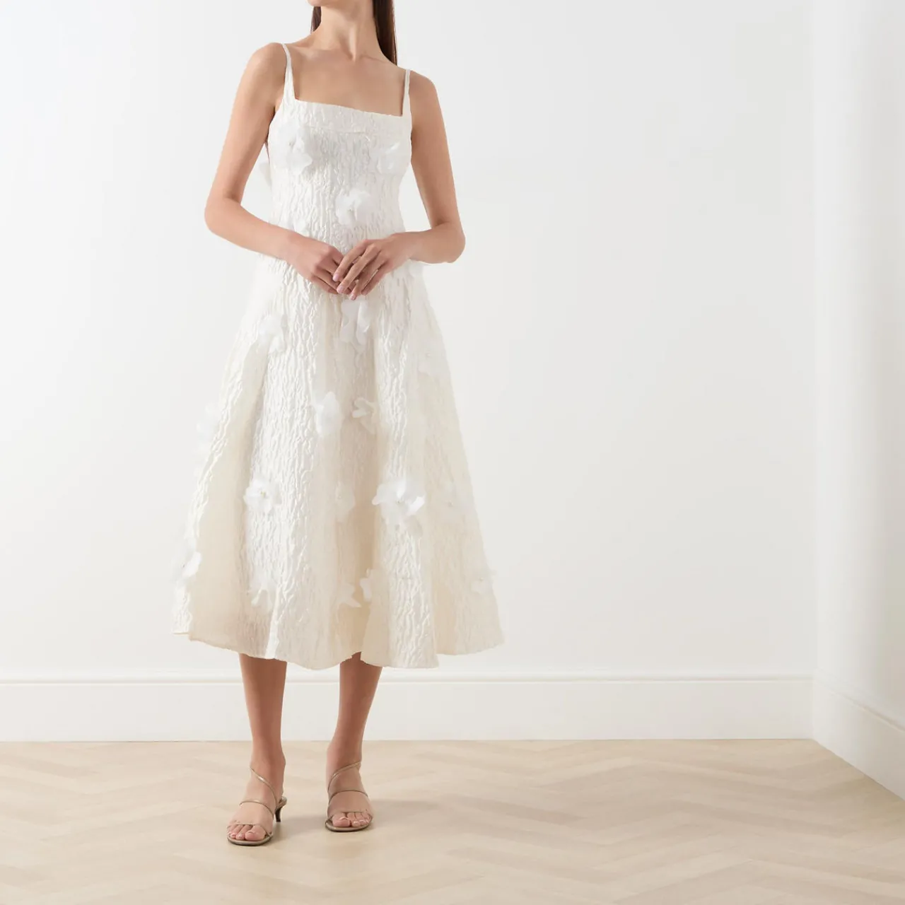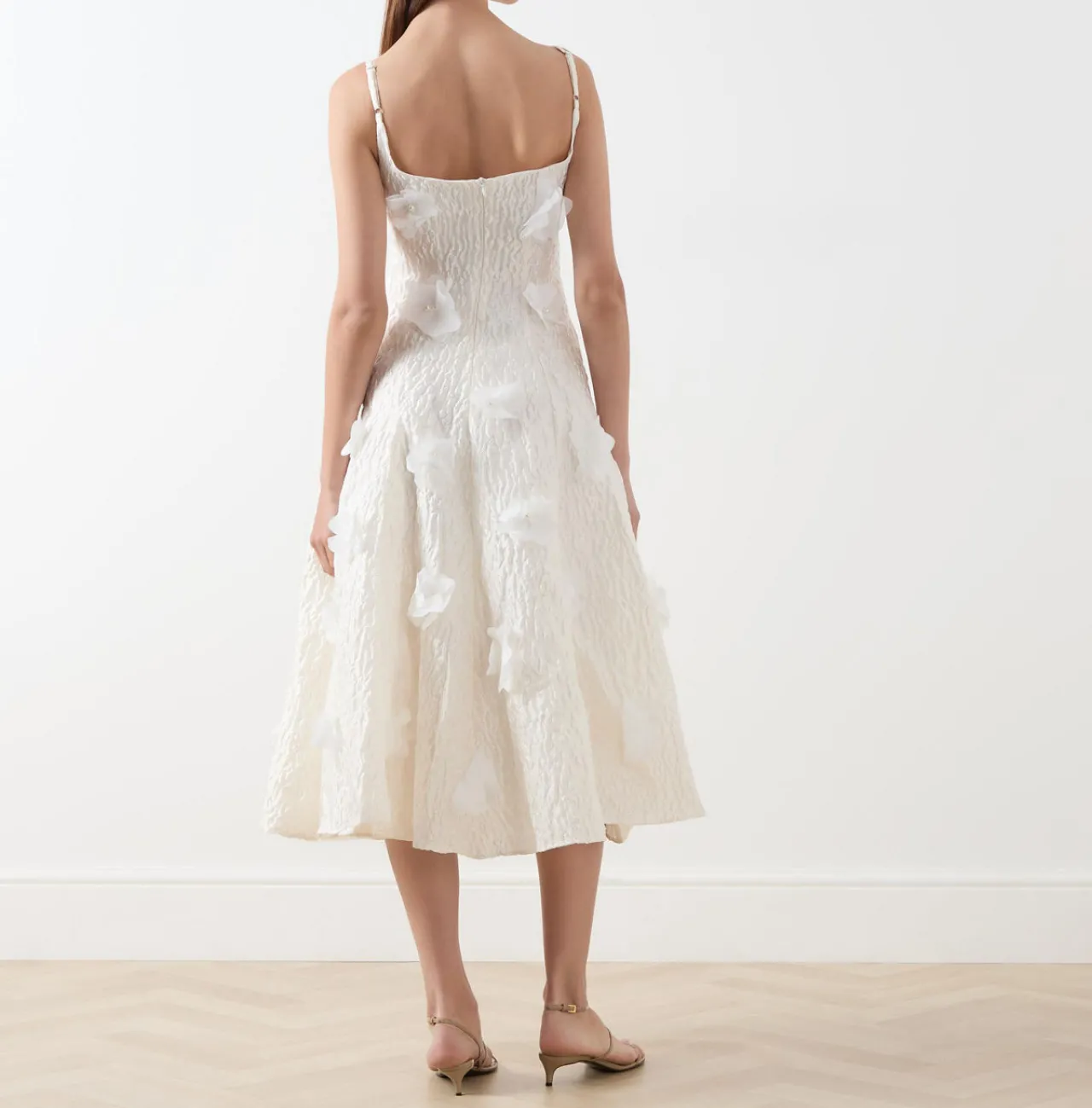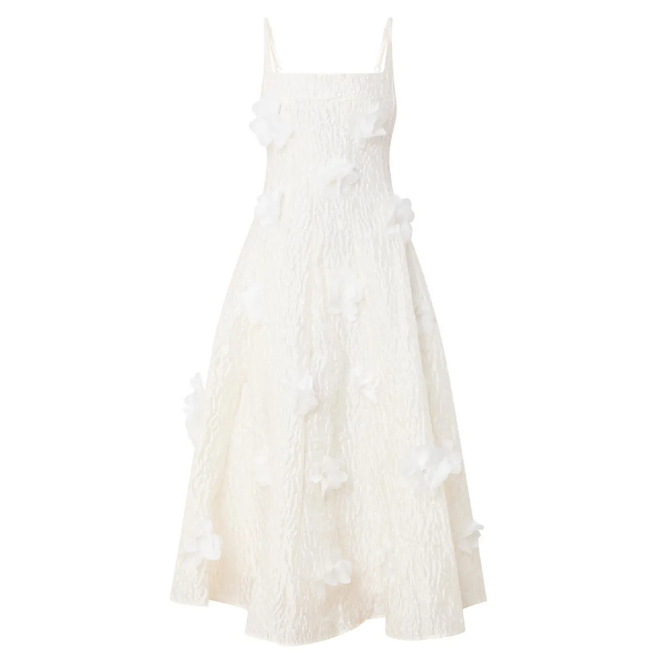 - Adjustable straps, square neckline, sleeveless, back zip-fastening closure, flower appliqué, flared silhouette, midi length, textured finish