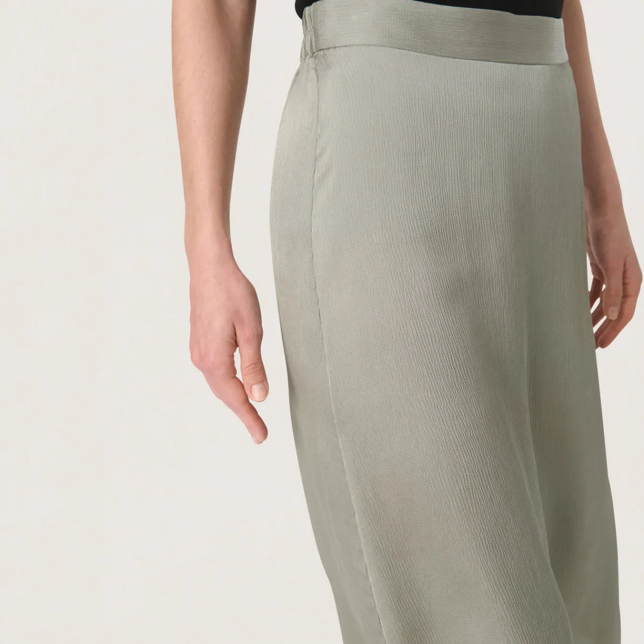 - Elasticated waistband, midi length, smooth satin finish