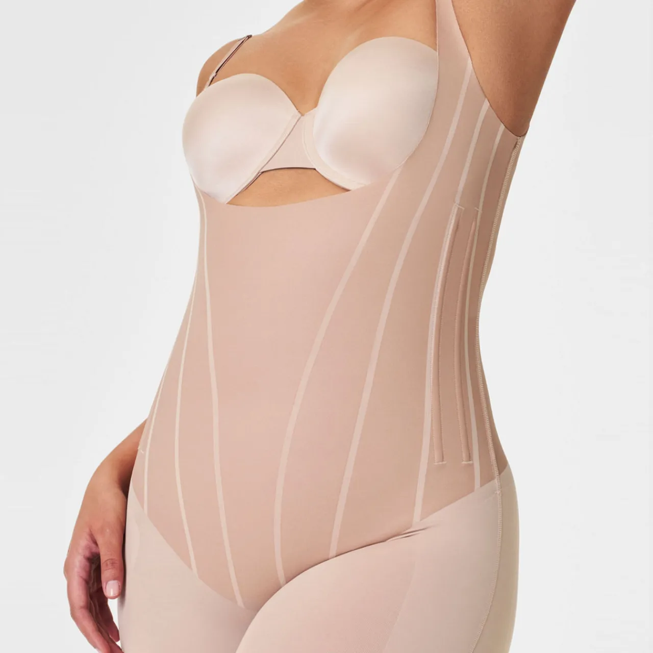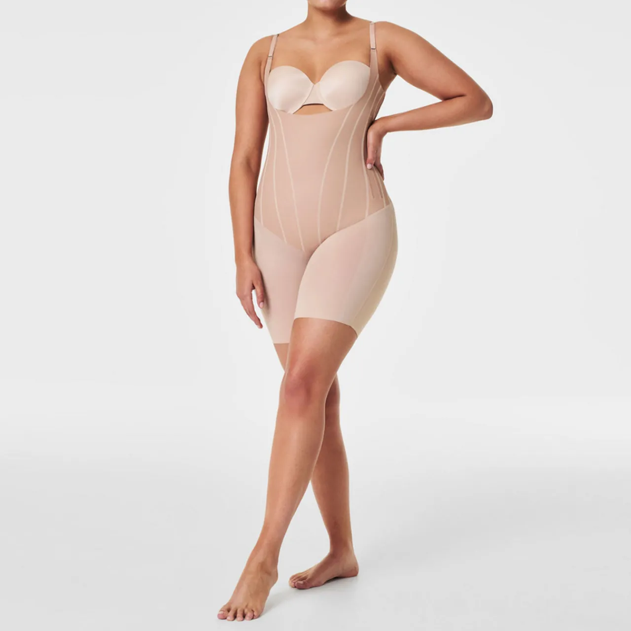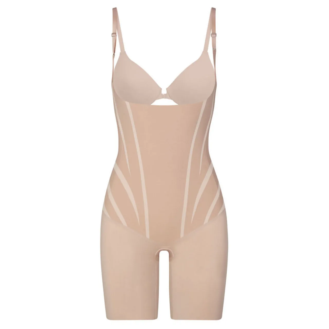 - Quick-drying and breathable fabric, single-layer Printed Power® technology, scooped open bust, adjustable straps, flexible corset-like boning, stay-put silicone waistband, targeted core compression, back seam shirring, open gusset, no dig, free-cut hems, mid-thigh length