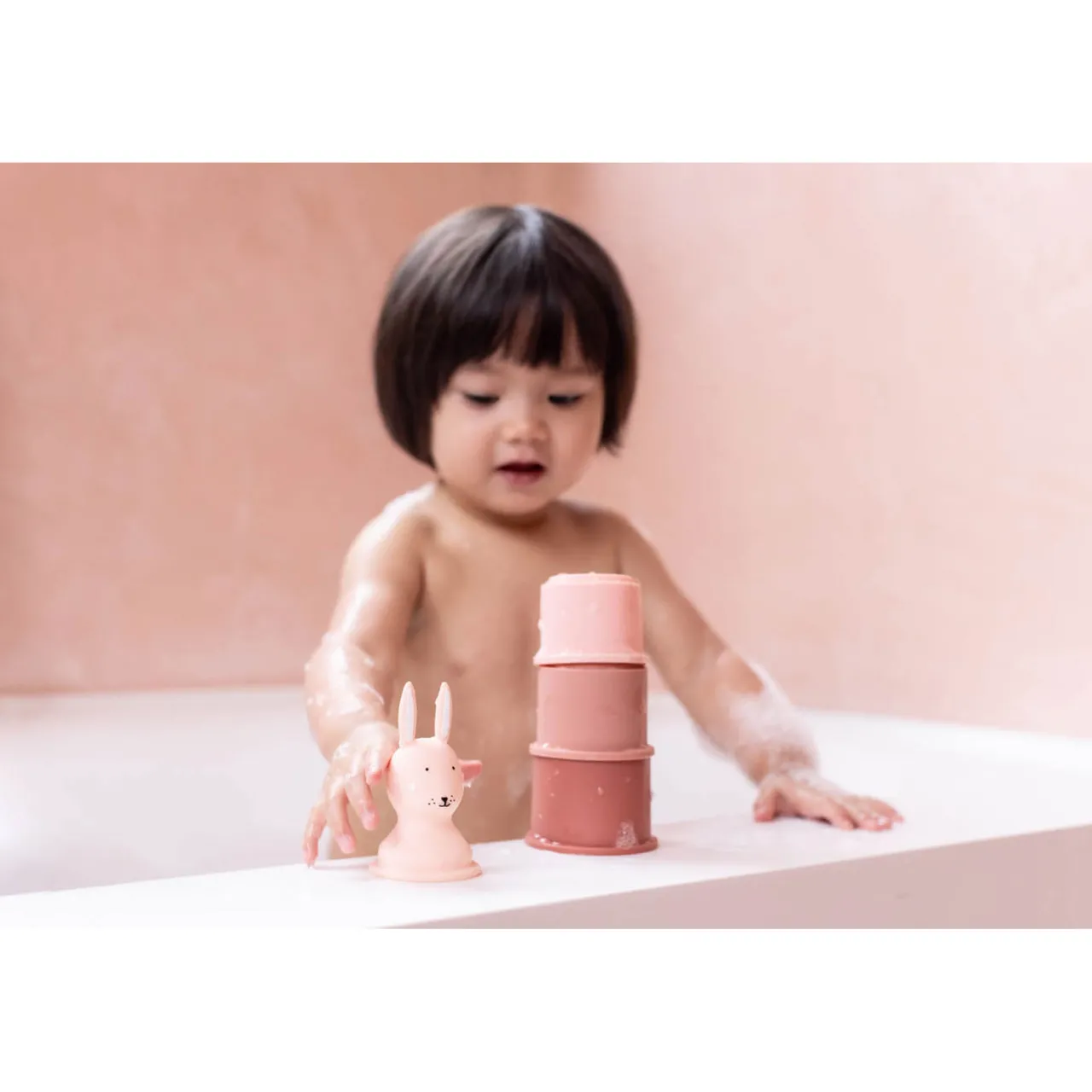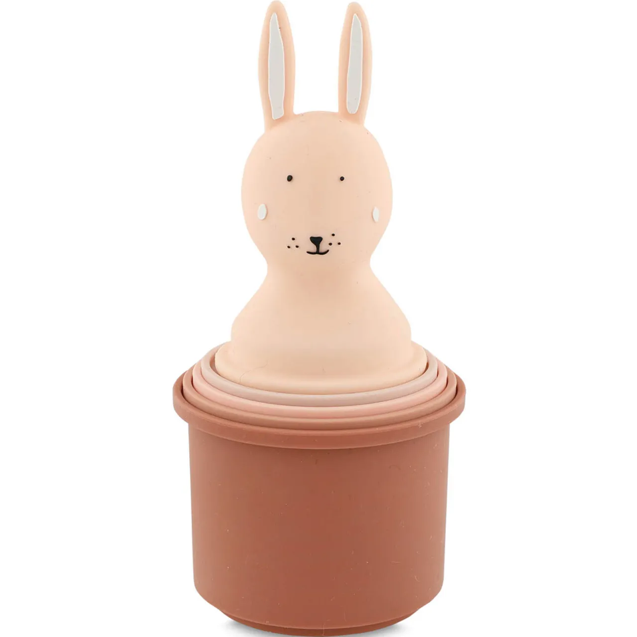 - Five-piece set, soft-touch silicone construction, stackable cups, some with holes to create water floats, some closed for filling and pouring, Mrs. Rabbit design