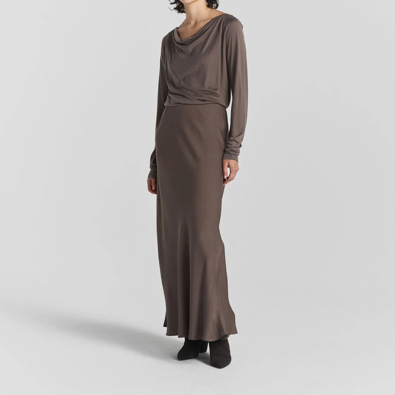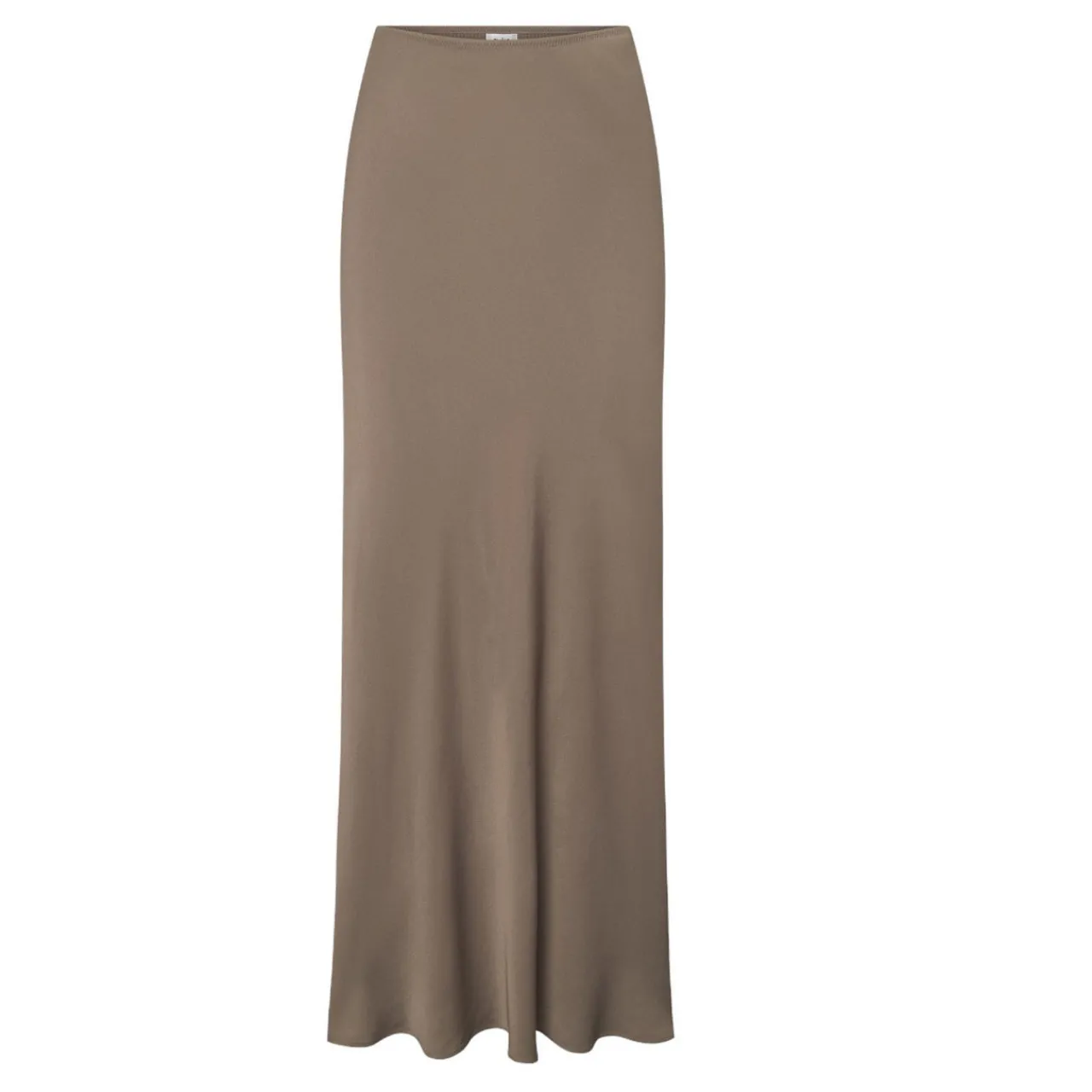 - High-rise, elasticated waistband, flared hem, bias-cut, shiny satin finish, maxi length