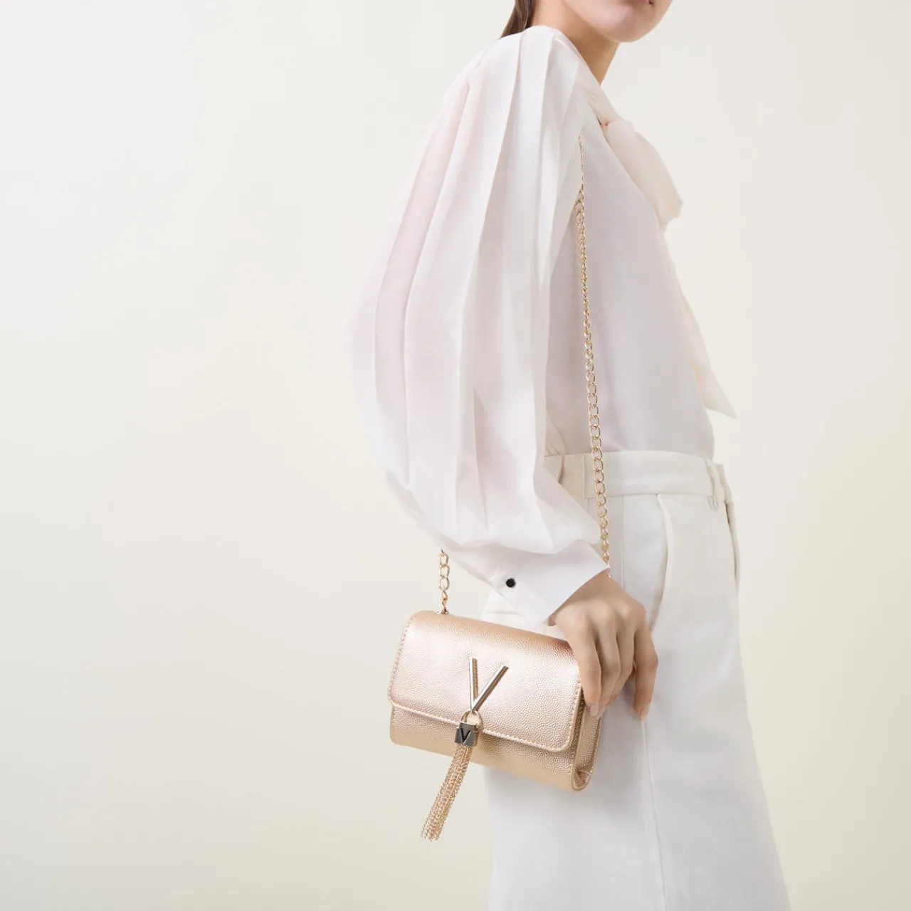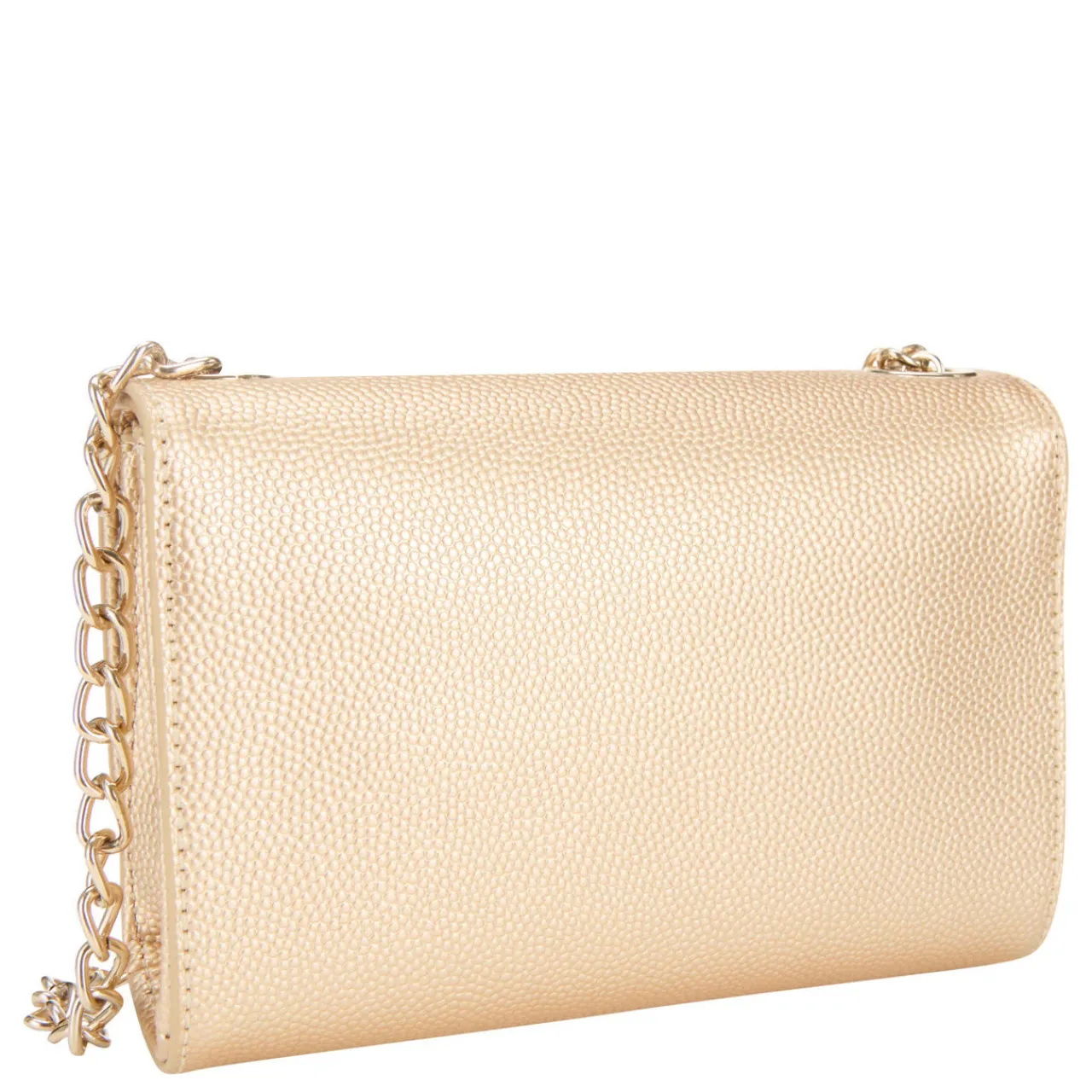 - Flap closure with snap clasp fastening, detachable chain strap, gold-tone hardware, V logo, tonal stitching, grained finish