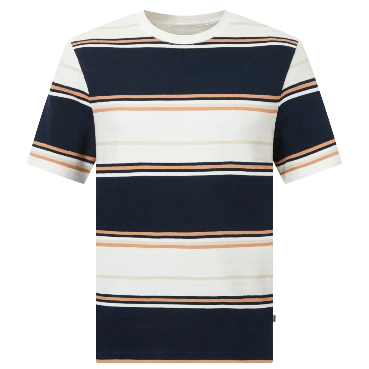 - Short sleeves, round neckline, striped pattern, contrasting colours, logo tag, tonal stitching, straight hemline, smooth fabric