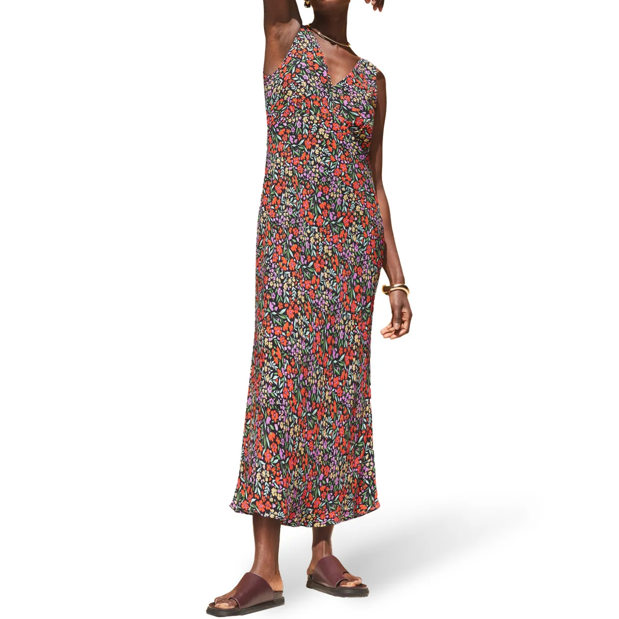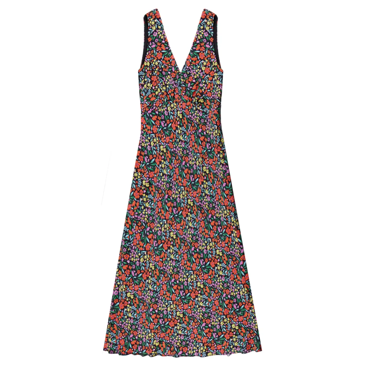 - Ditsy floral print, midi length, woven, sleeveless, V-neckline