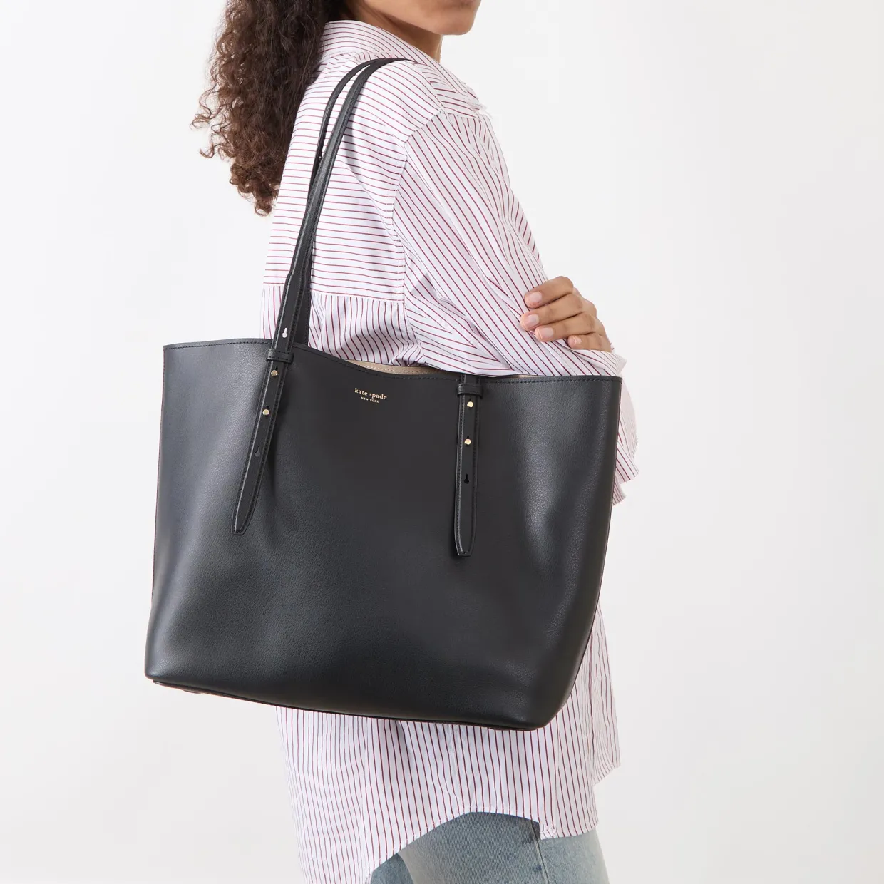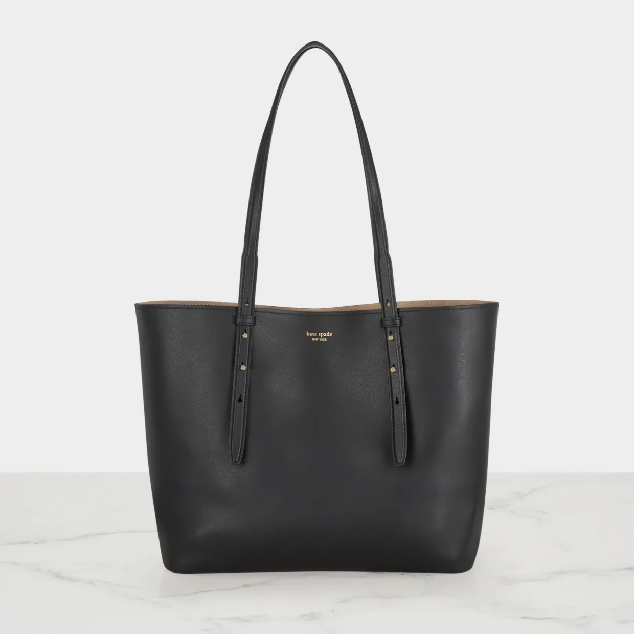 - Adjustable top carry handles, open top, boxy silhouette, gold-tone hardware, suede & twill lining, grained finish, foil logo detail
