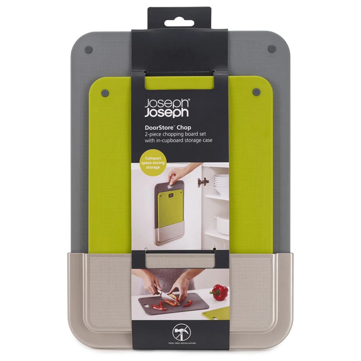 - Slimline storage case, easy, tool-free installation using strong 3M™ VHB™ adhesive tape, double-sided chopping boards, non-slip feet, knife-friendly, textured cutting surfaces, BPA free