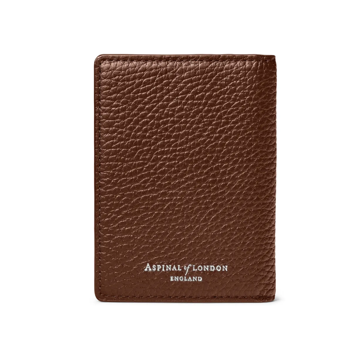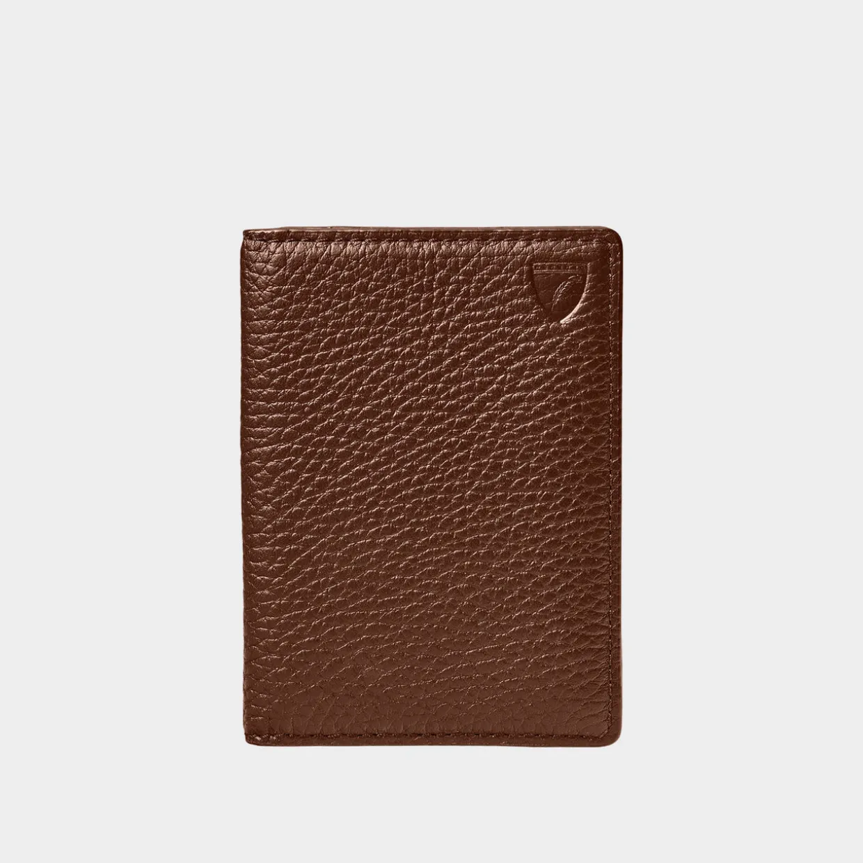 - Fold-over design, six card slots, lined, grained leather texture, lined, slimline, logo lettering