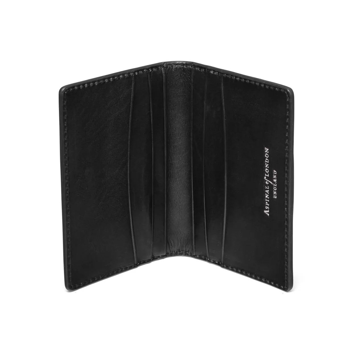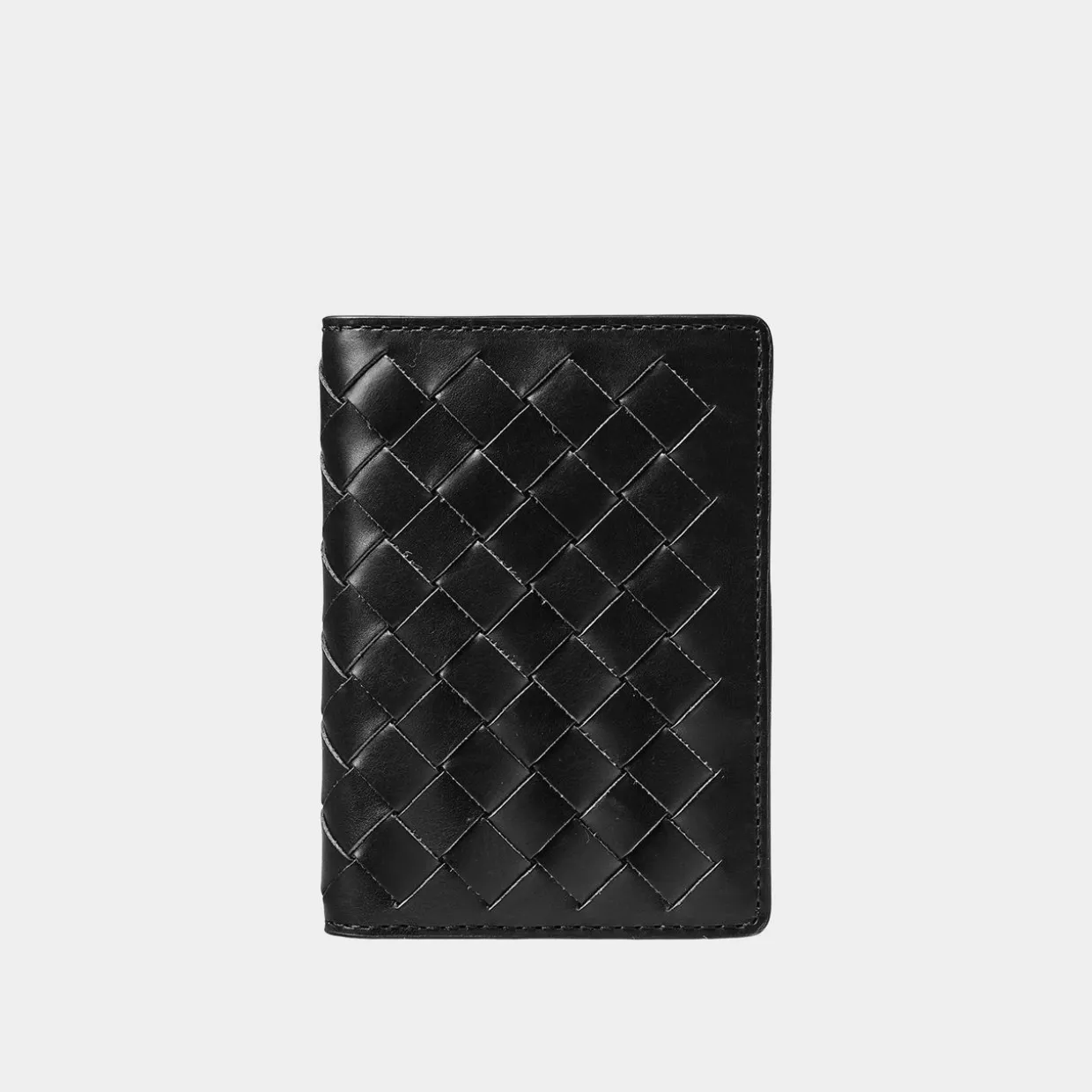 - Fold-over design, six card slots, lined, woven leather design, lined, slimline, logo lettering