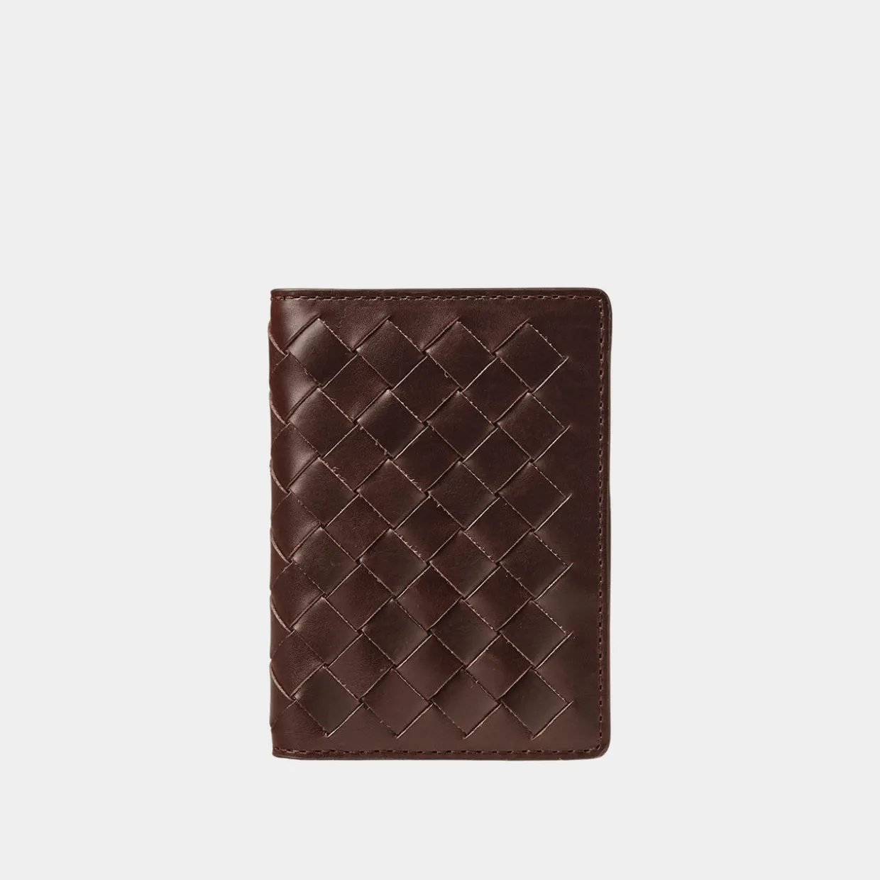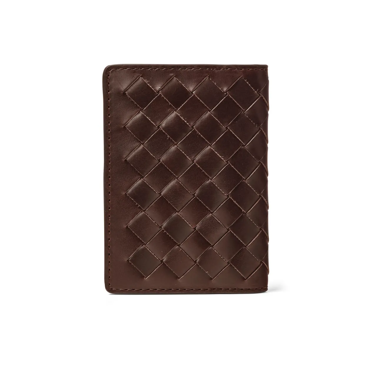 - Fold-over design, six card slots, lined, woven leather texture, lined, slimline, logo lettering