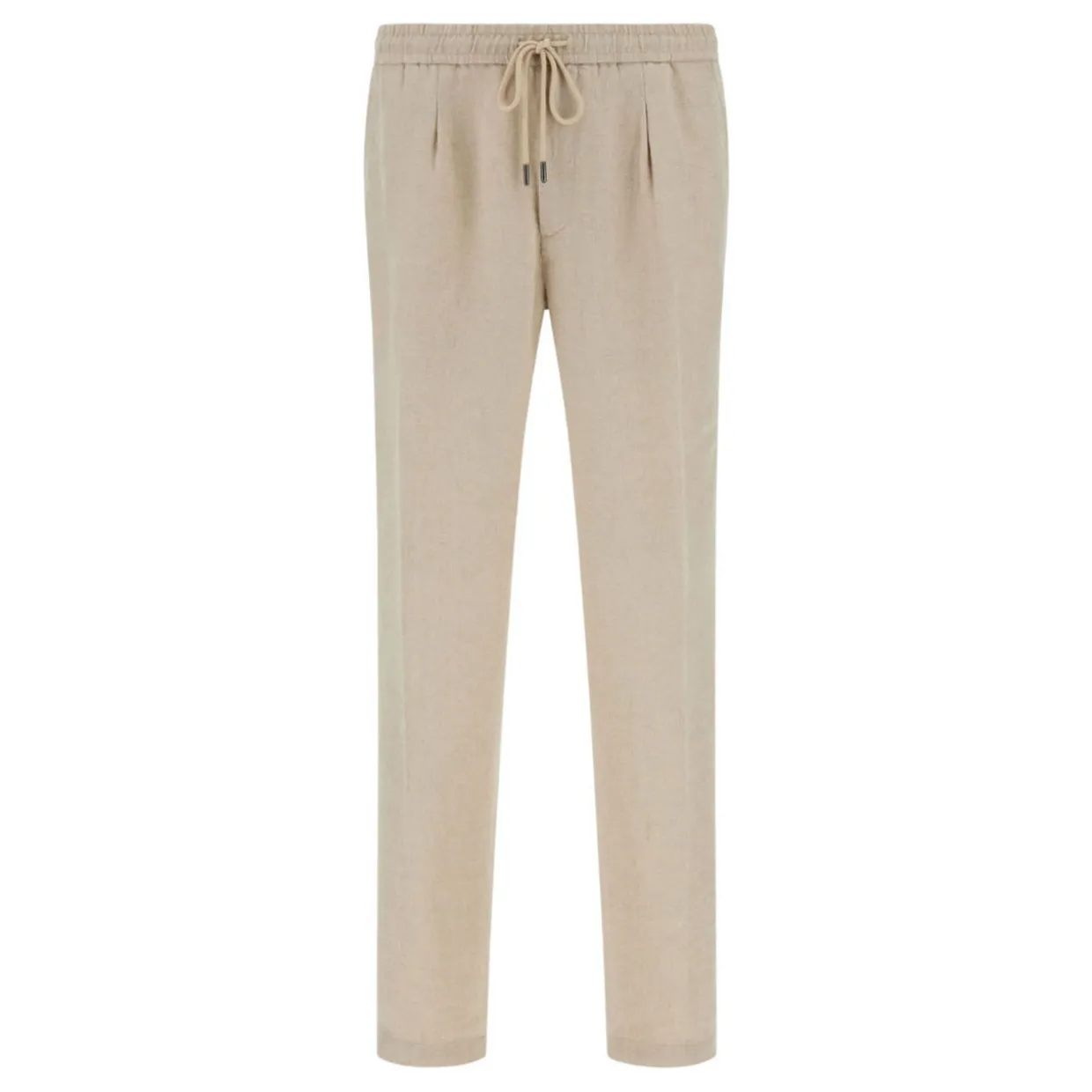 - Mid-rise, slim leg, elasticated waistband with drawstring fastening, front pleats, two side slit pockets, two rear welt pockets, clean hems, logo tag, lightweight