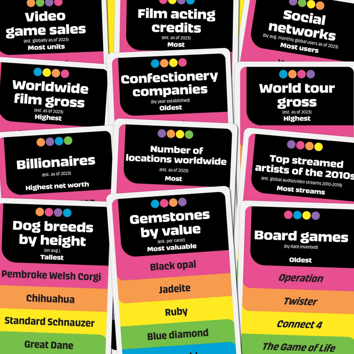 - For 2 or more players, includes tower, 6 pucks, 60 double-sided cards, and game rules