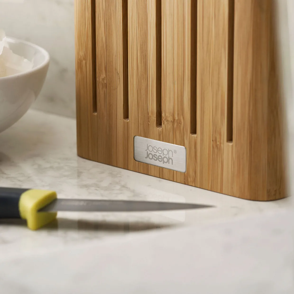 - Elevate™ knives feature weighted handles and integrated tool rests to prevent blades from touching the work surface when placed down, blades made from Japanese stainless-steel, slimline block saves space on your worktop, magnetic knife slots holds knives securely in place