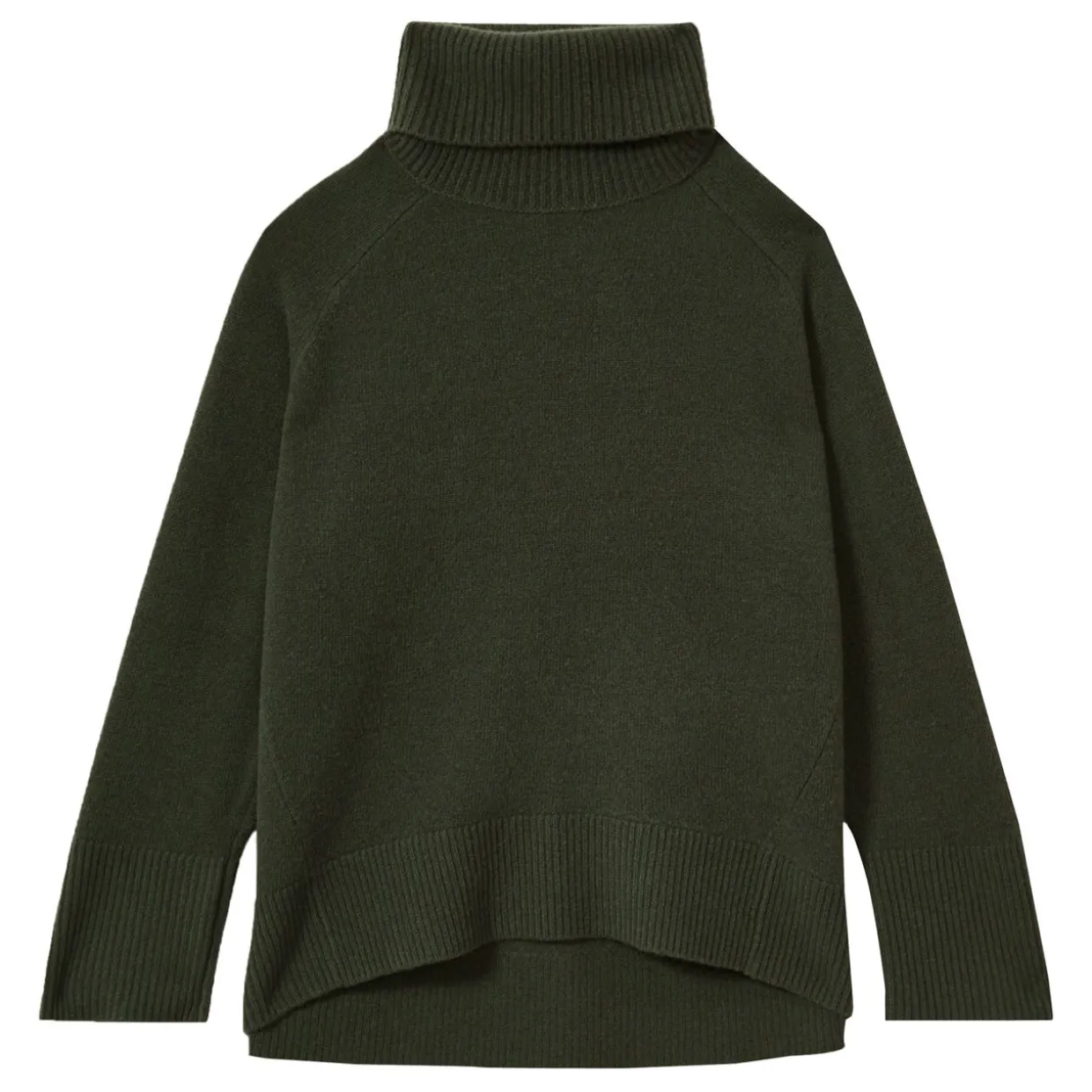 - Roll neckline, long sleeves, ribbed trims, knit structure, stitched details at back