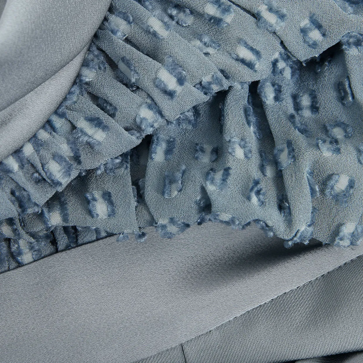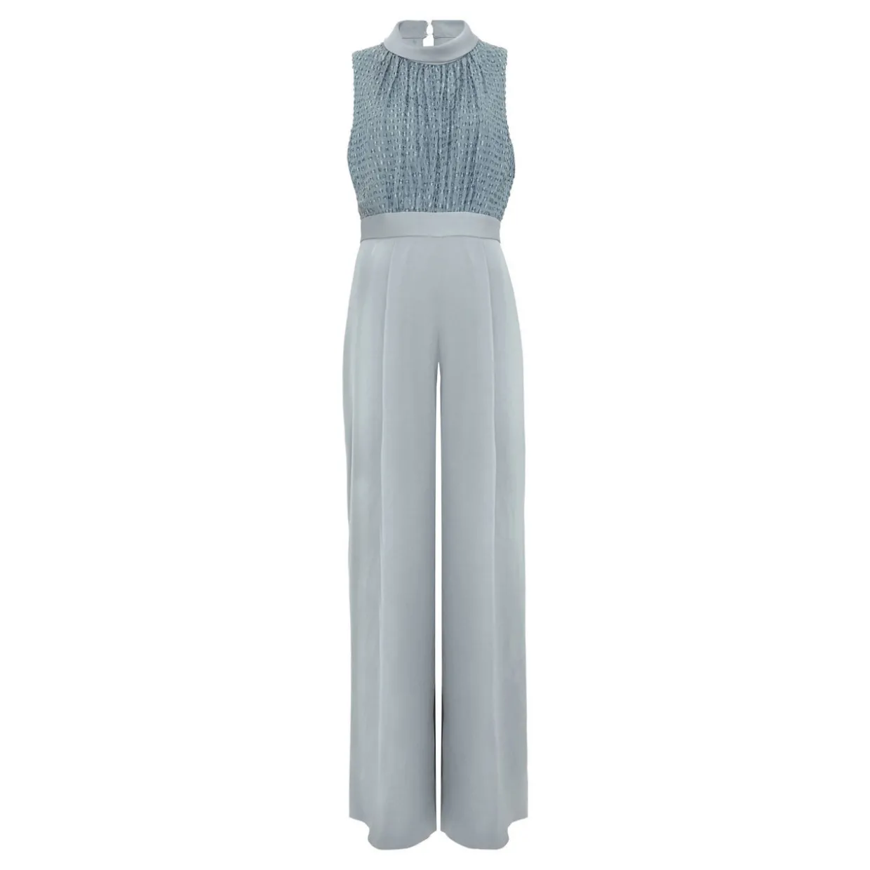 - High neckline, sleeveless, textured pattern, intricate pleating, wide leg silhouette, concealed zip fastening, keyhole and button fastening