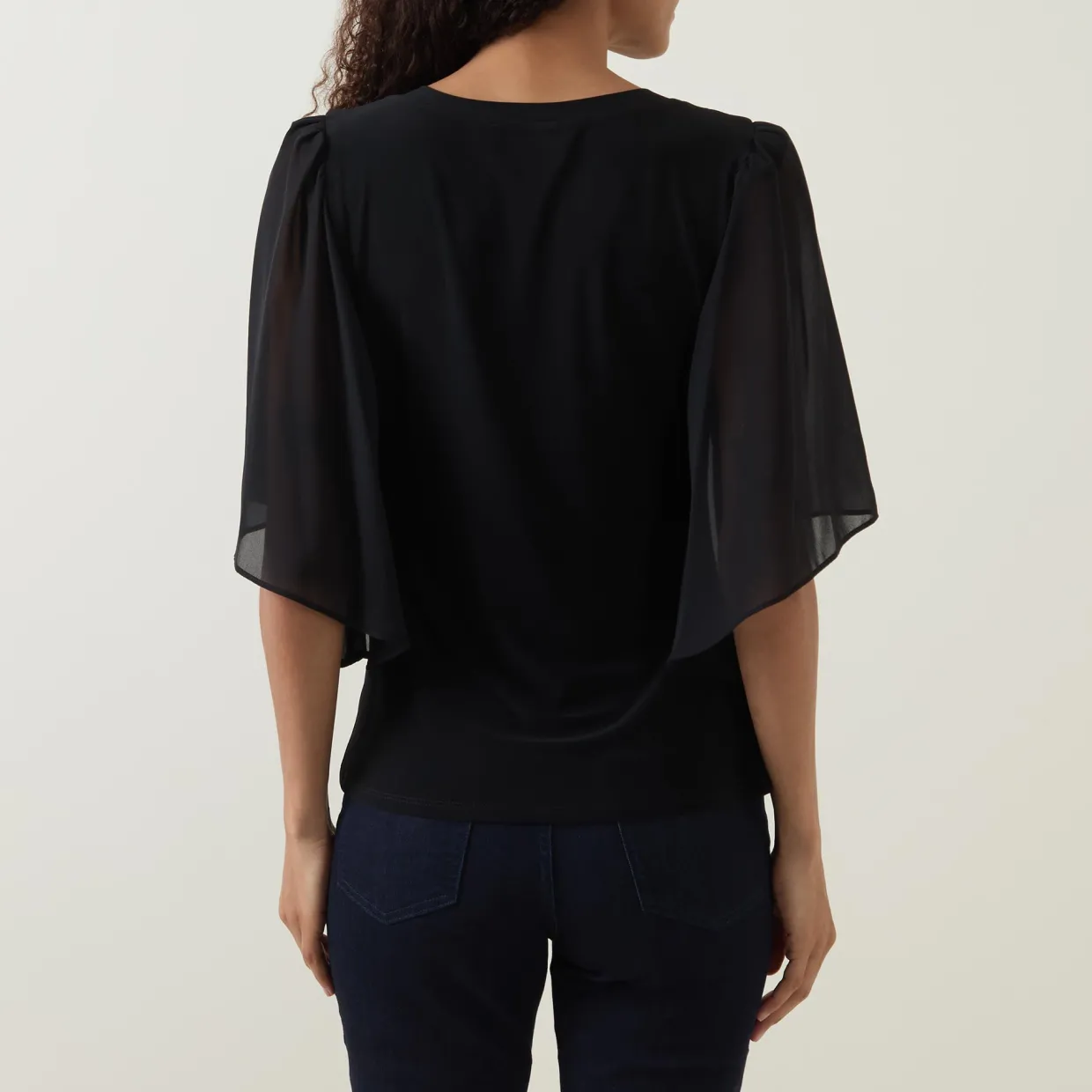 - Scoop neckline, sheer short sleeves, silver-tone hardware with ruched details at hem