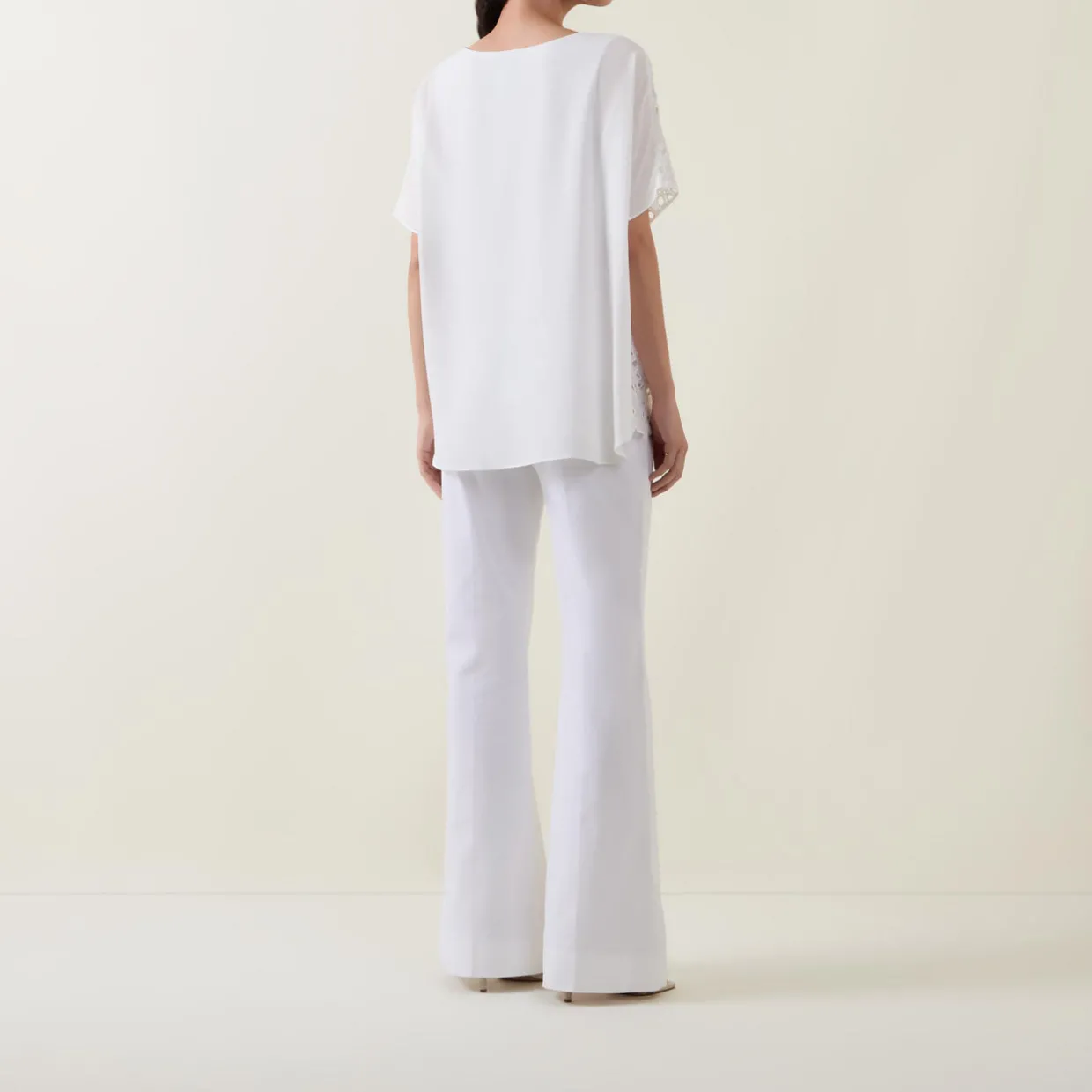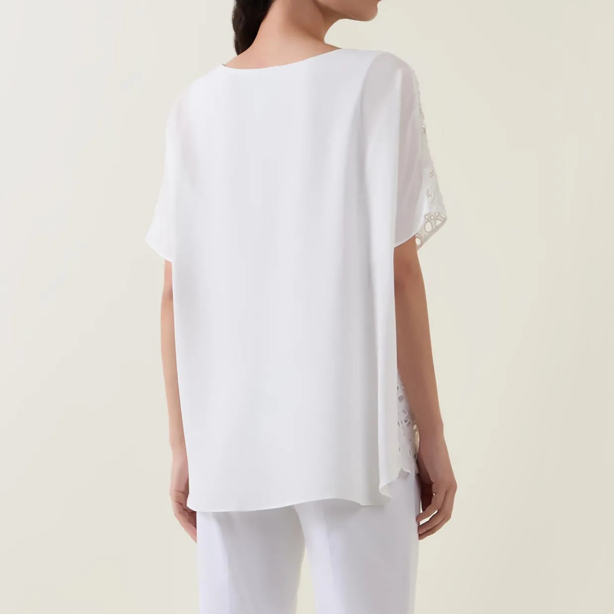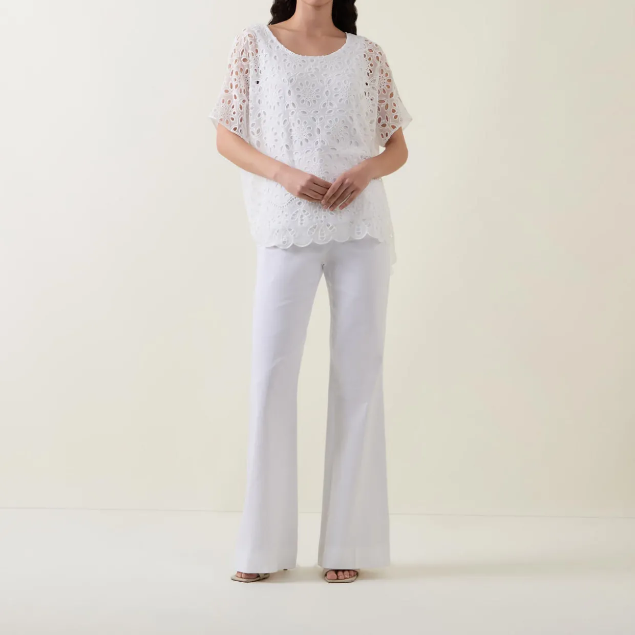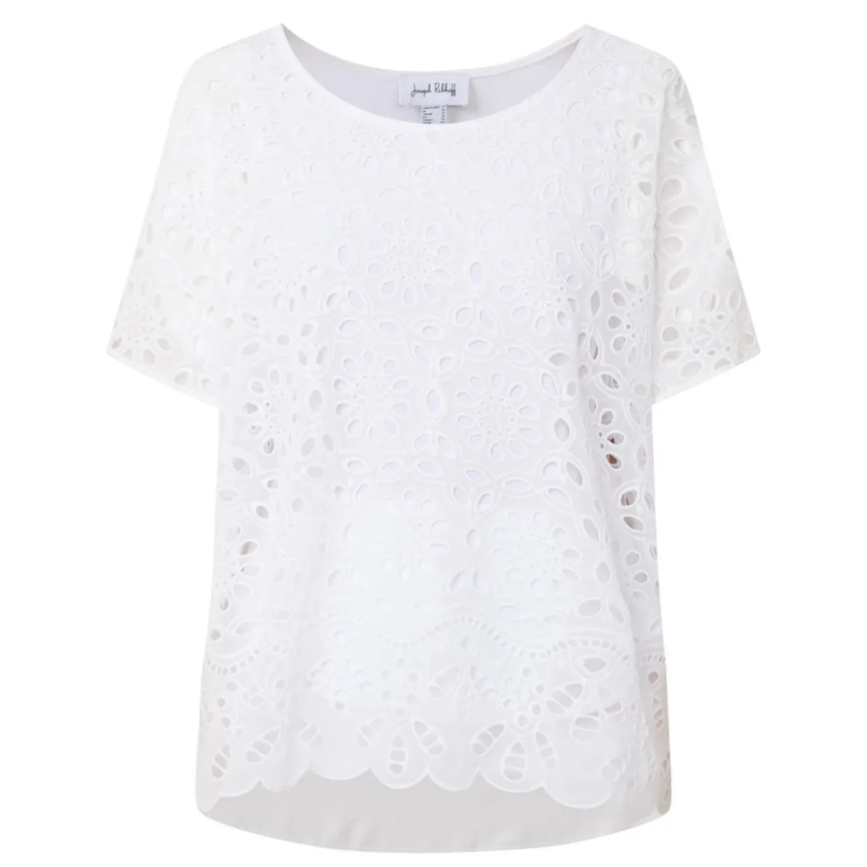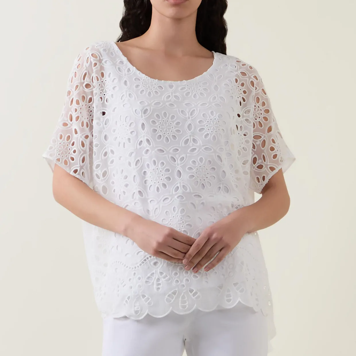 - All-over eyelet embroidery, short dolman sleeves, round neck, boxy fit, scalloped hem