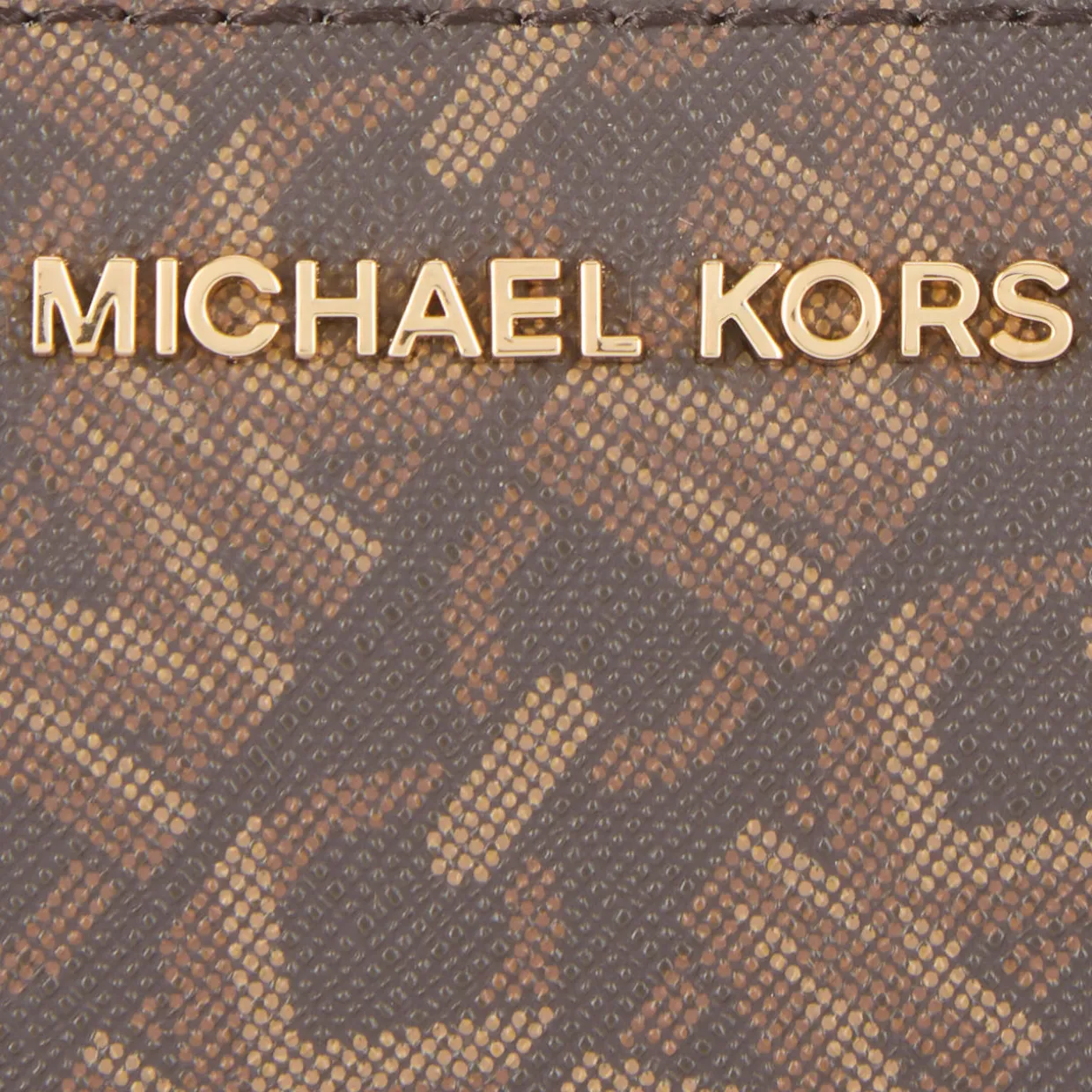 - Flap closure with snap-button fastening, logo lettering, gold-tone hardware, MK logo motif, back card slot, top zip-fastening pocket, tonal stitching, grained leather finish