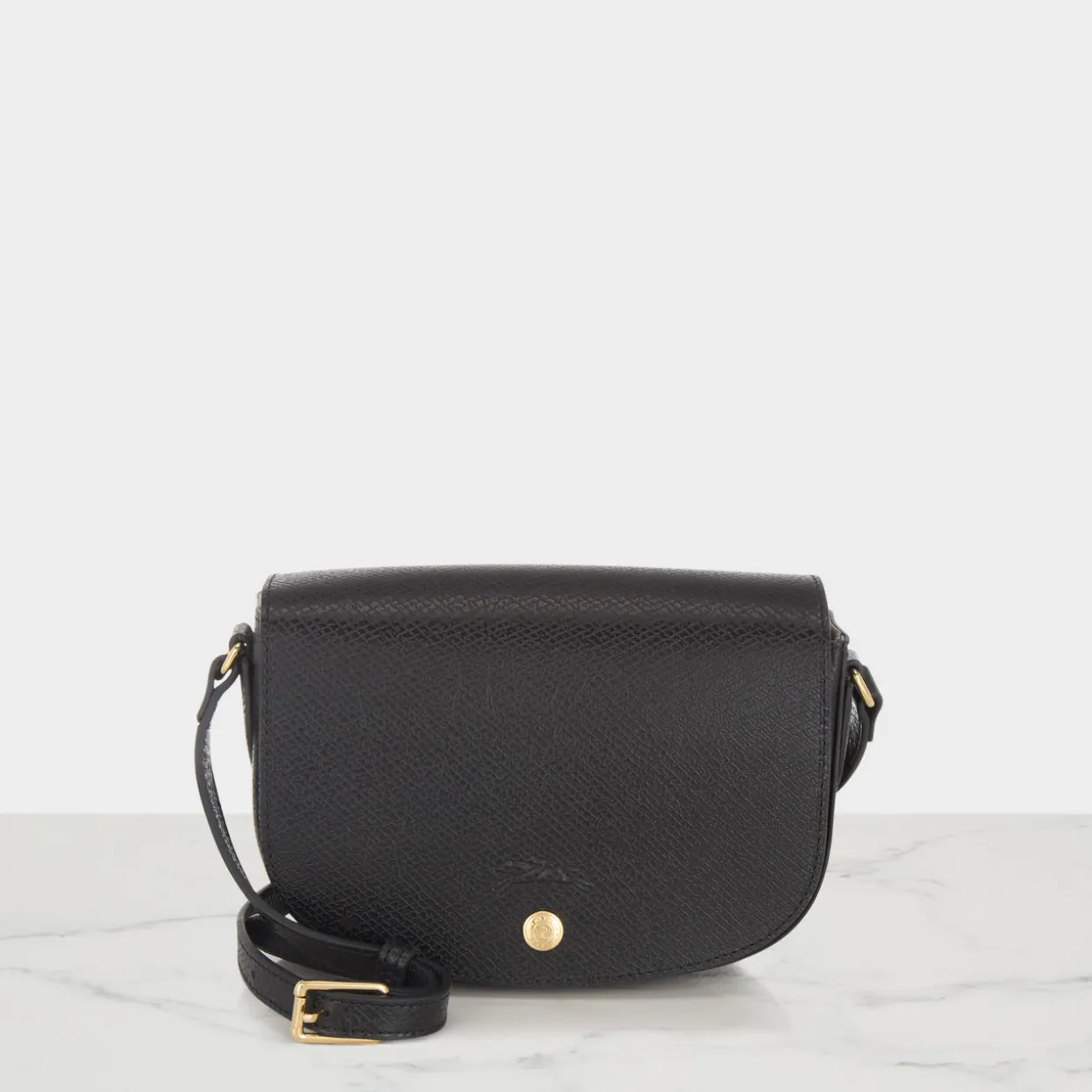 - Flap with snap button fastening, adjustable crossbody strap, contrast stitching, gold-tone hardware, logo detail, textured finish