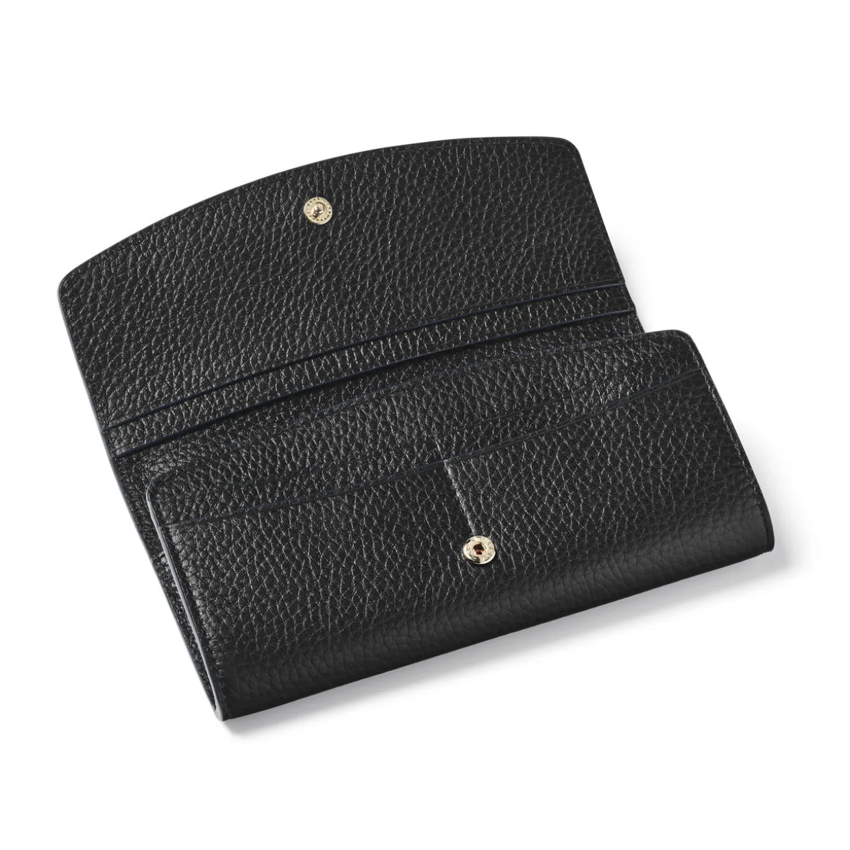 - Full-grain leather, fold-over style, snap closure, brand logo details, zipped reverse pocket