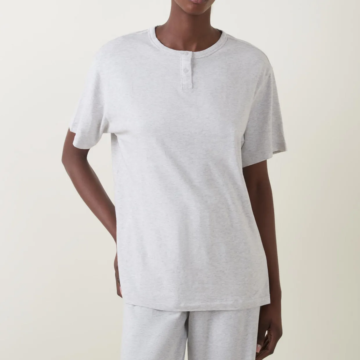 - Crew neck, Henley style, two button placket, dropped shoulders, short sleeves, straight hem, rear logo tag, super soft finish, stretch fabric