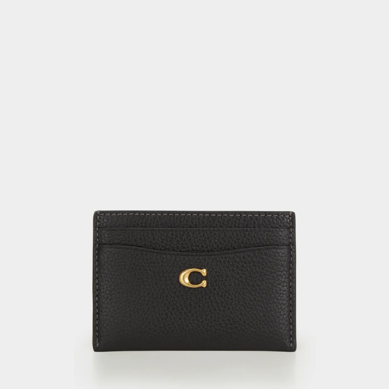 - Four card slots, tonal stitch detailing, gold-tone logo hardware, pebbled leather finish