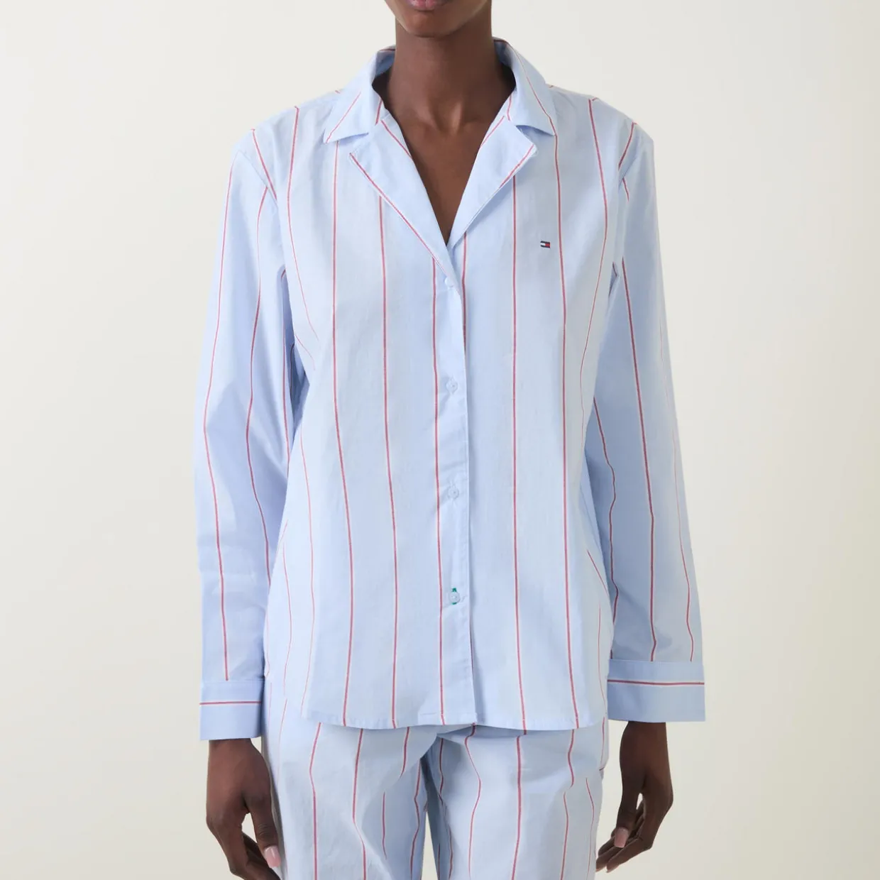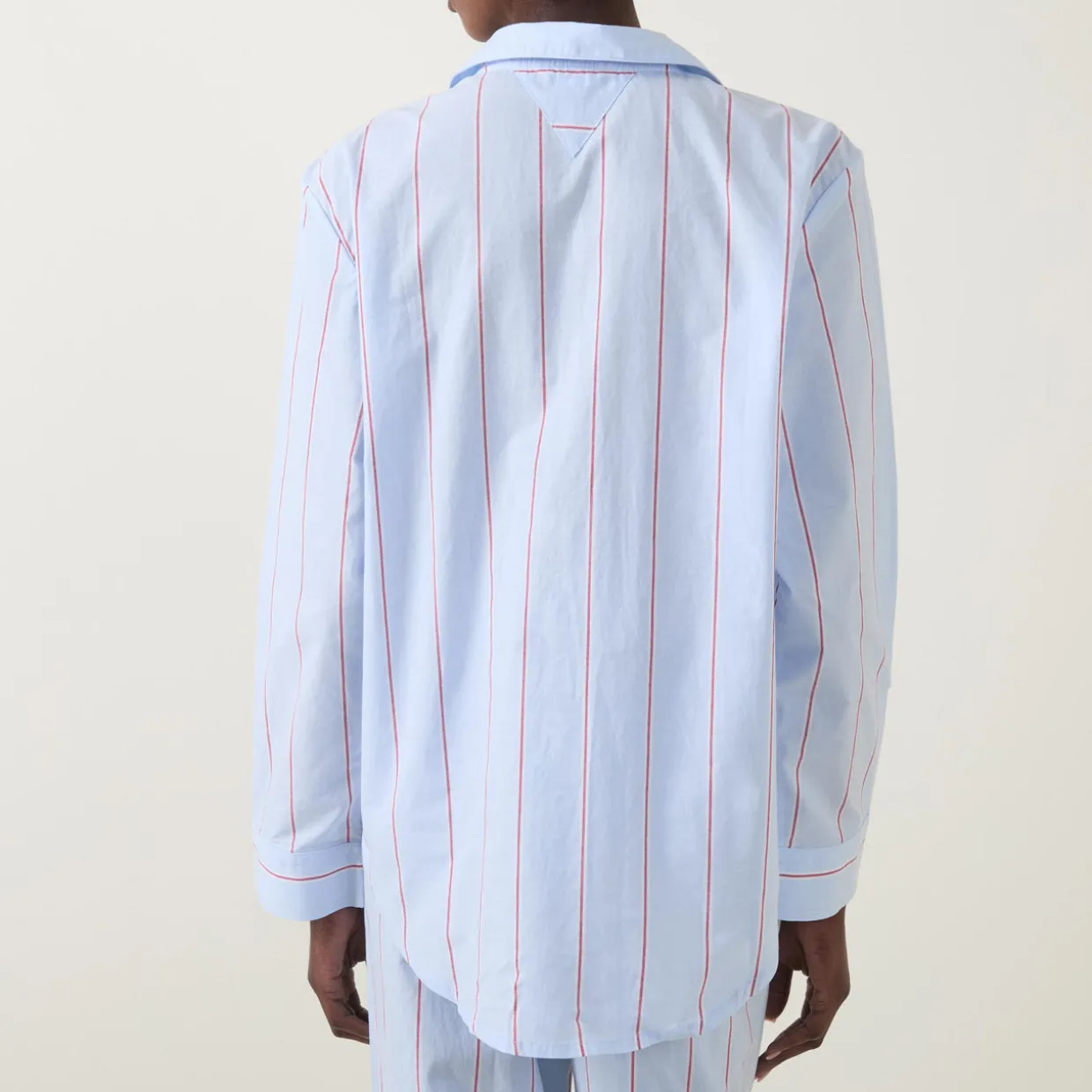 - Notch lapel collar, long sleeves, front button fastening, curved hem, embroidered logo detail on the chest, striped design, breathable fabric