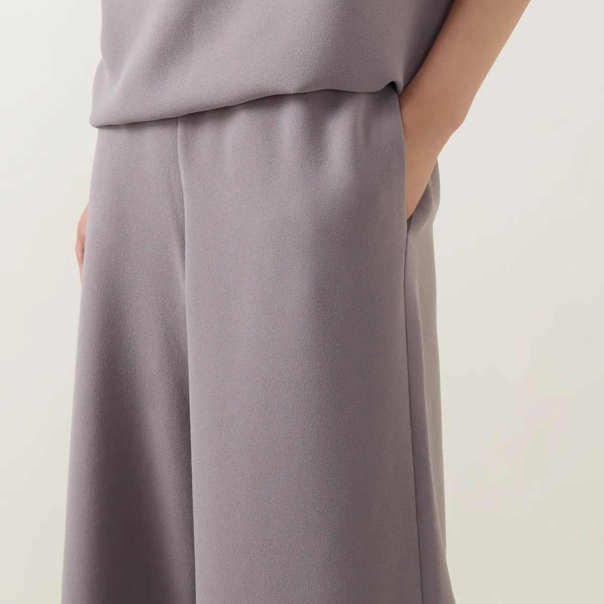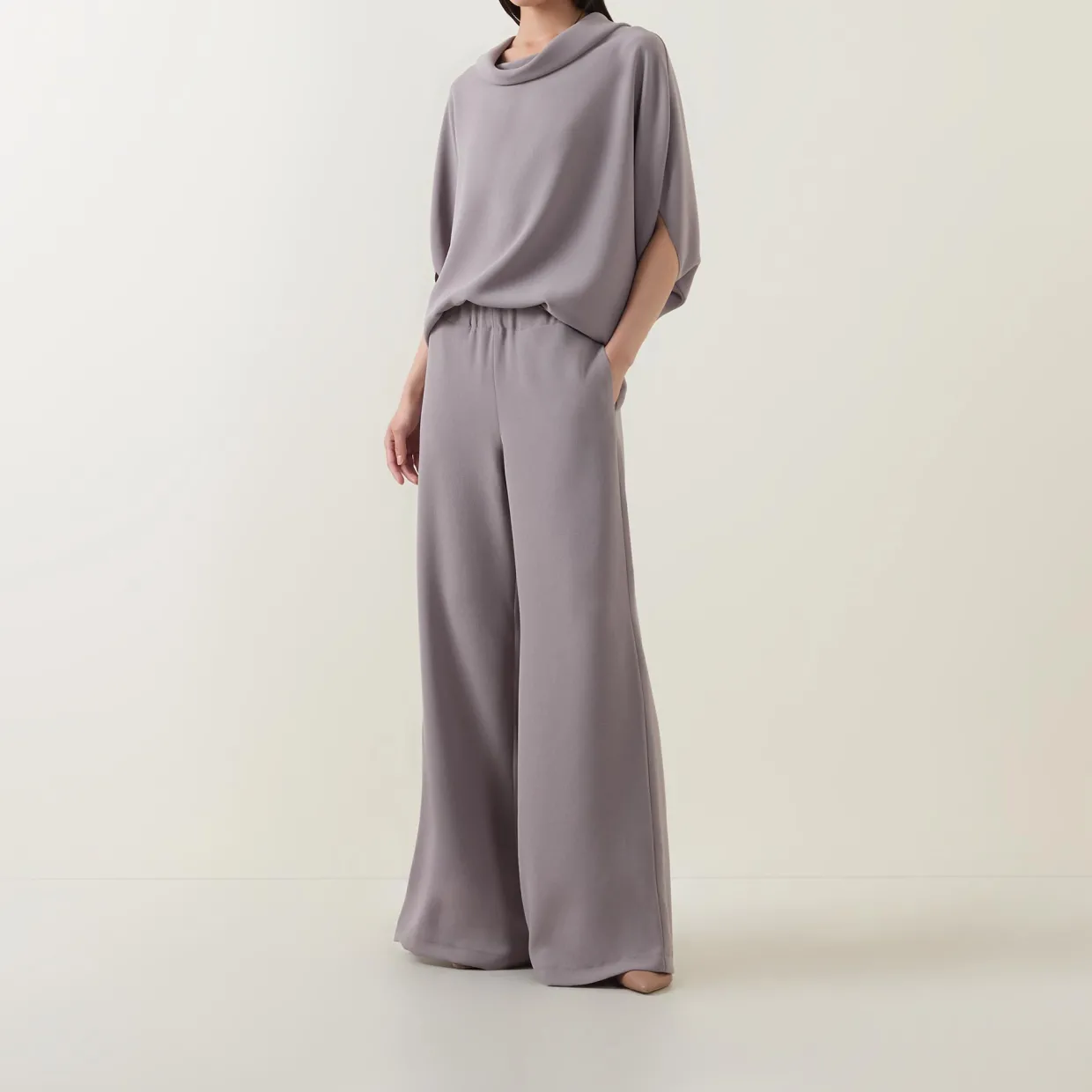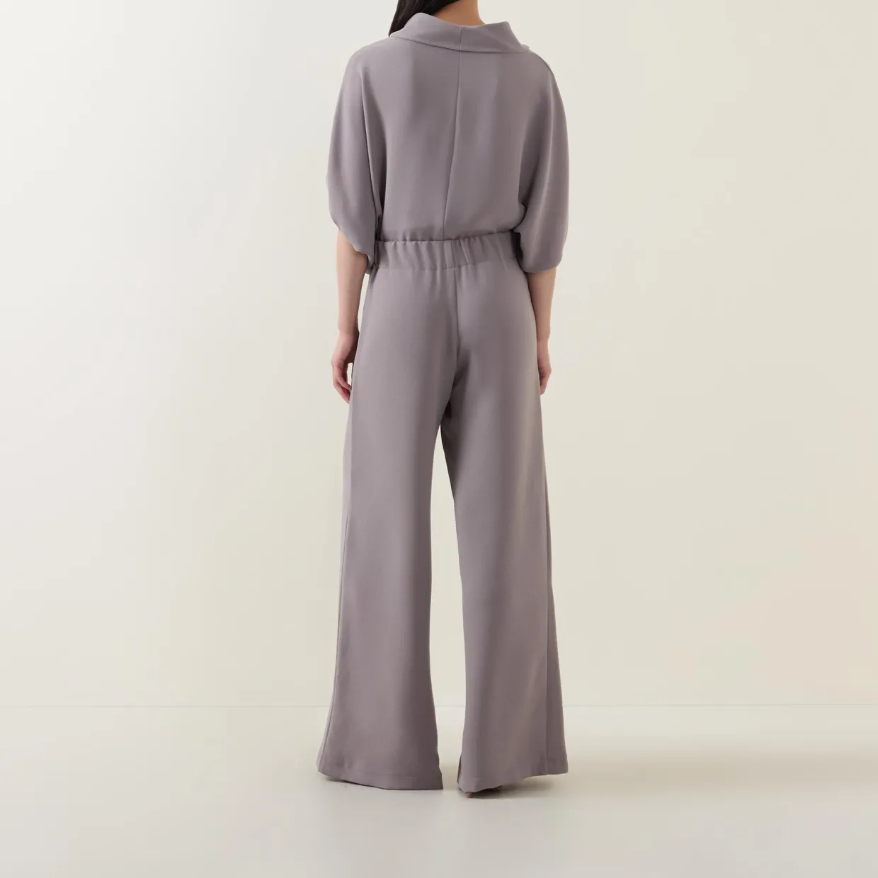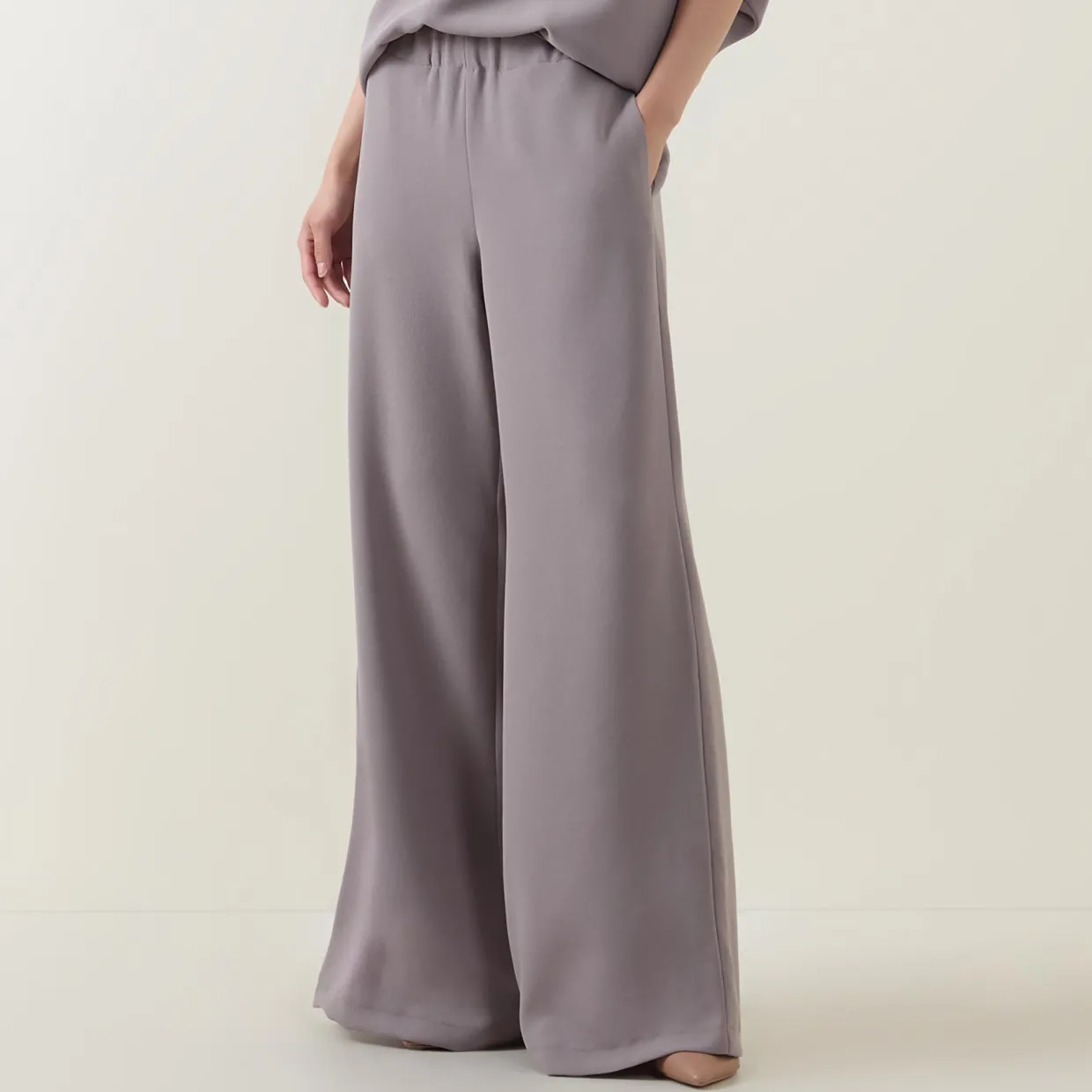 - High-rise, wide leg, full length, elasticated waistband, two side seam pockets, clean hems, smooth finish