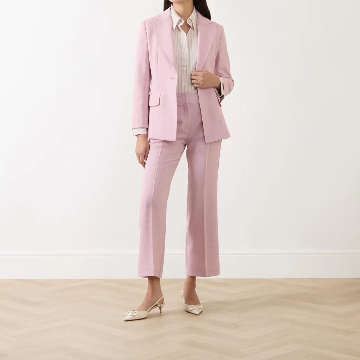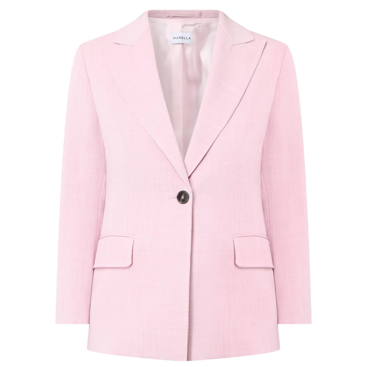 - Peaked lapels, single-breasted, button fastening, flap pockets, non-vented, buttoned cuffs, textured finish