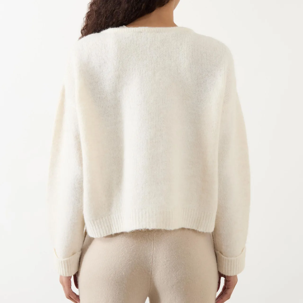 - V-neckline, curved hemline, long sleeves, ribbed trims