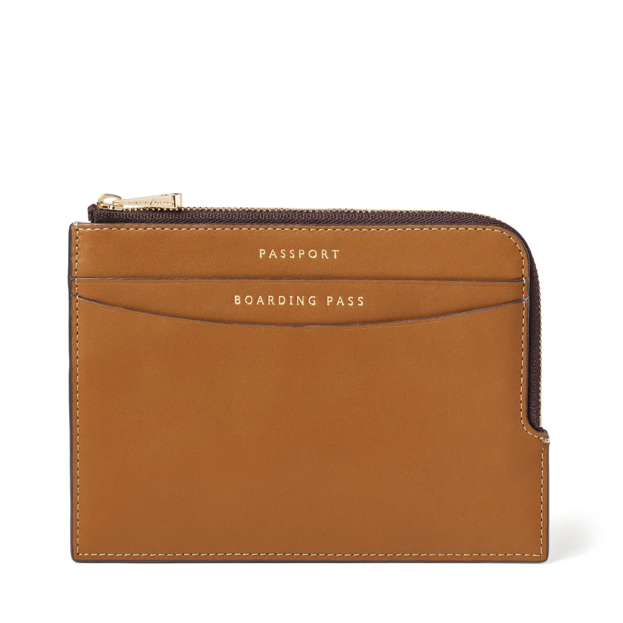 - Handcrafted, full-grain leather, compact, slimline design, slots for tickets and passport, zipped compartment for storing currency