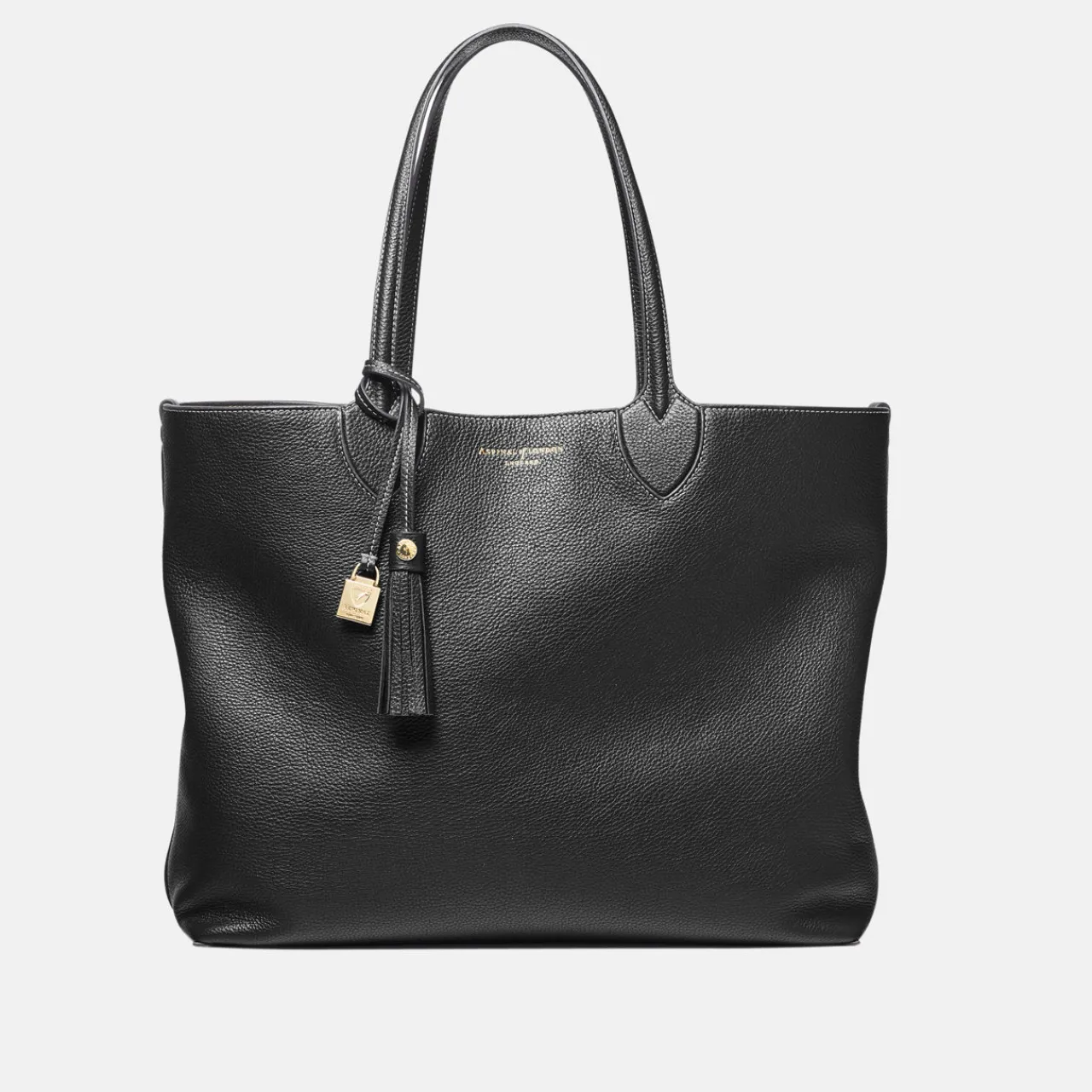 - Two carry handles, open top design, signature hardware detailing, contrast stitching, removable tassel, logo design, pebbled leather finish