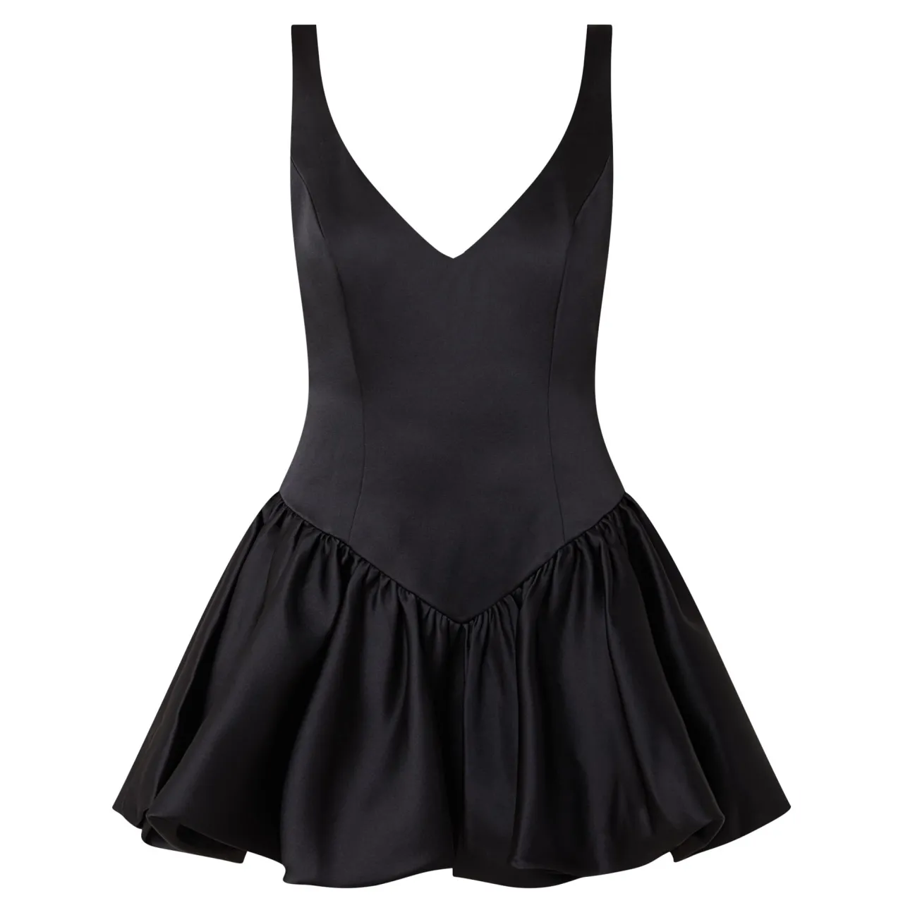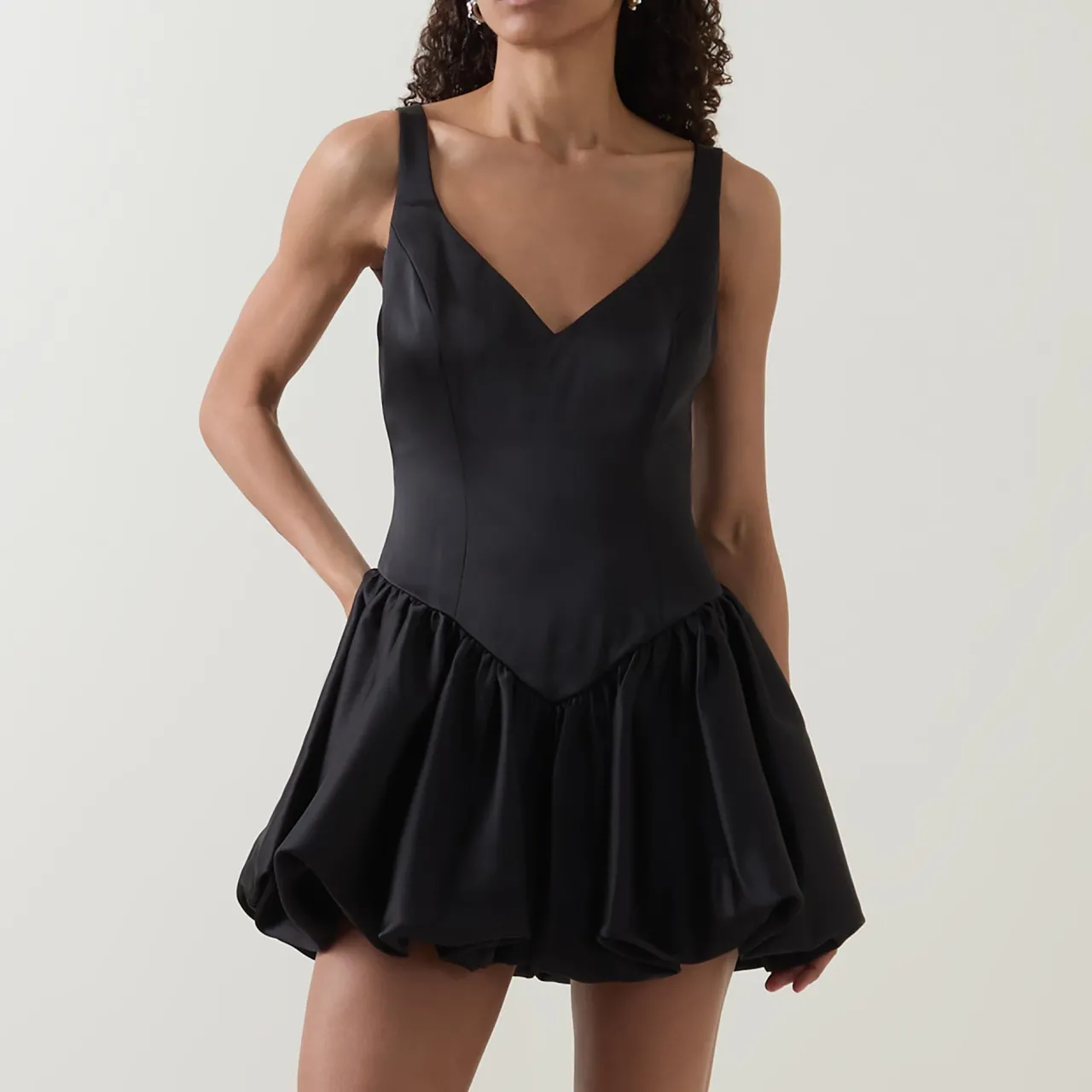 - Sleeveless, wide straps, V-neckline, back zip-fastening closure, bubble hemline, mini length, smooth fabric