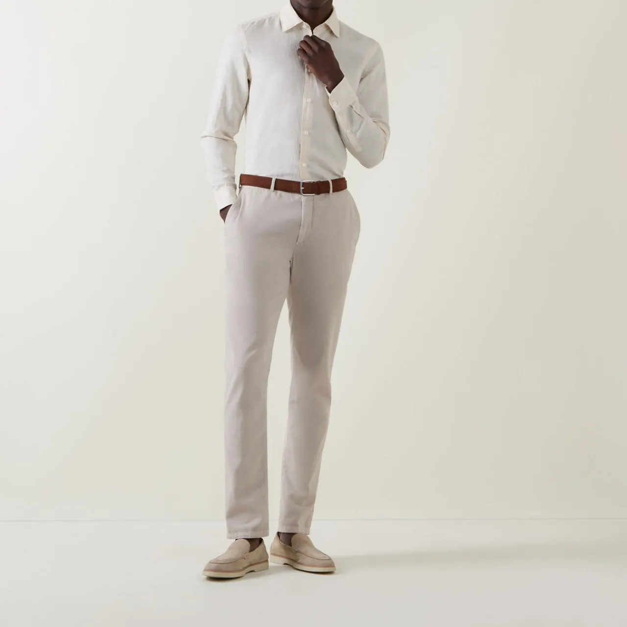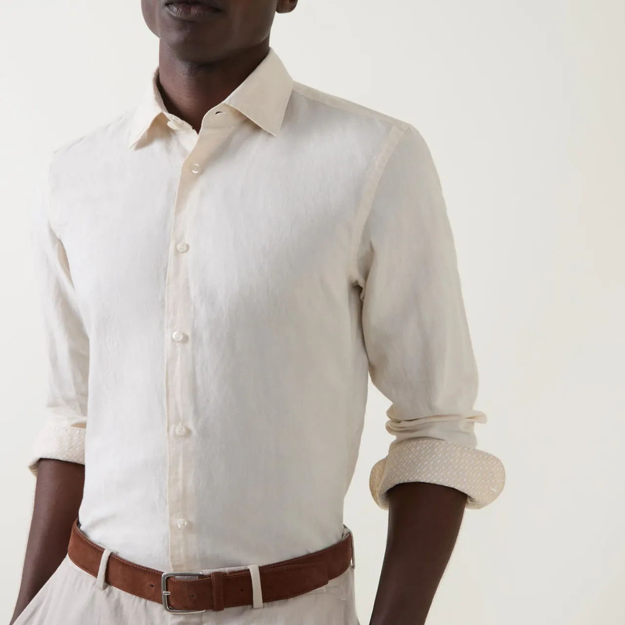 - Pointed collar, long sleeves, button fastening, tonal stitching, single-button cuffs, curved hemline, smooth fabric