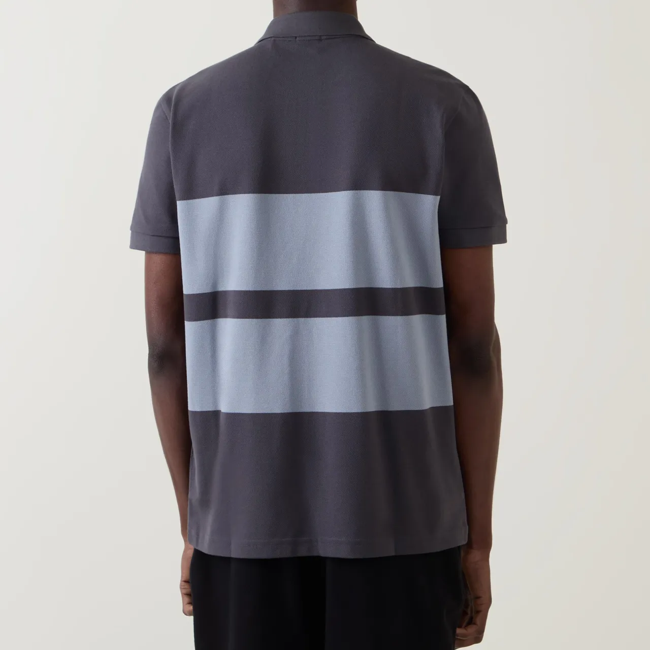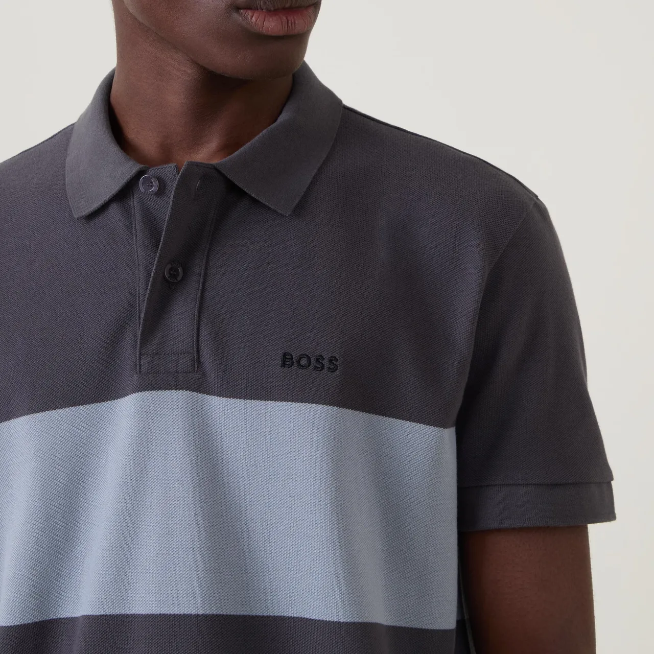 - Polo collar, two button fastenings, large stripe design, small logo detail