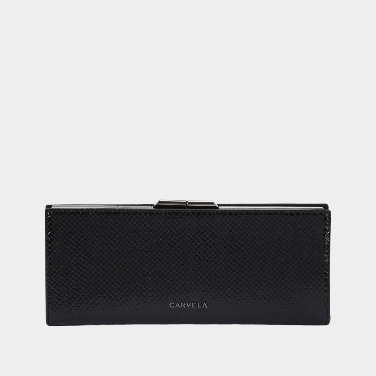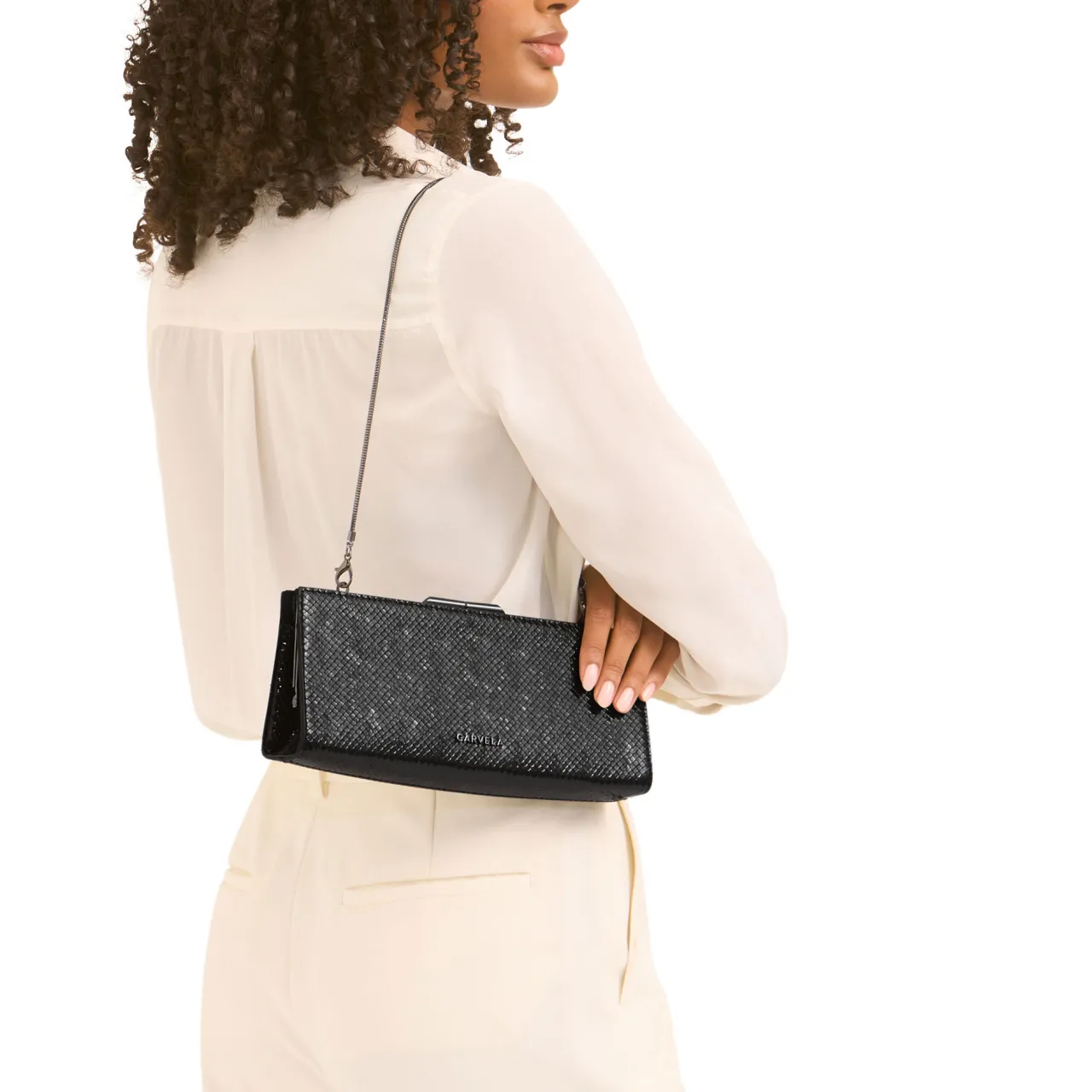 - Mini silhouette, shoulder strap, lizard-embossed leather alternative, gunmetal clasp, chain strap