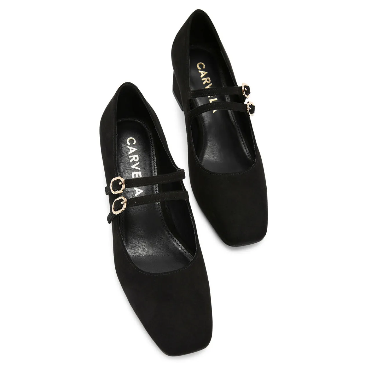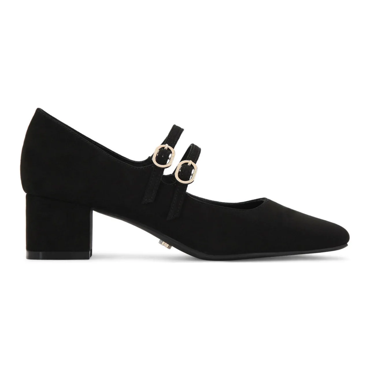 - Squared toe, double strap with buckle fastening, adjustable fit, block heel, low vamp, textured finish, padded insole, logo details