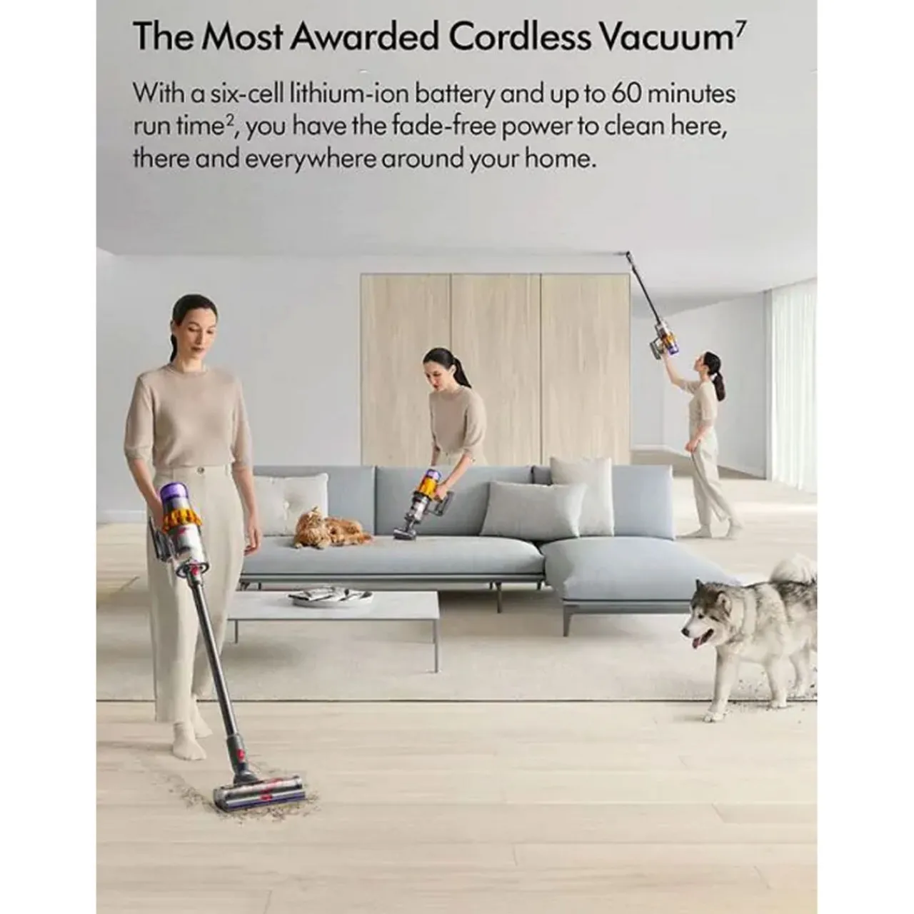 The Most Awarded Cordless Vacuum: The Dyson V15 Detect Absolute cordless vacuum generates 240 air watts of powerful fade-free suction with up to 60 minutes run time to deep clean your whole home.
