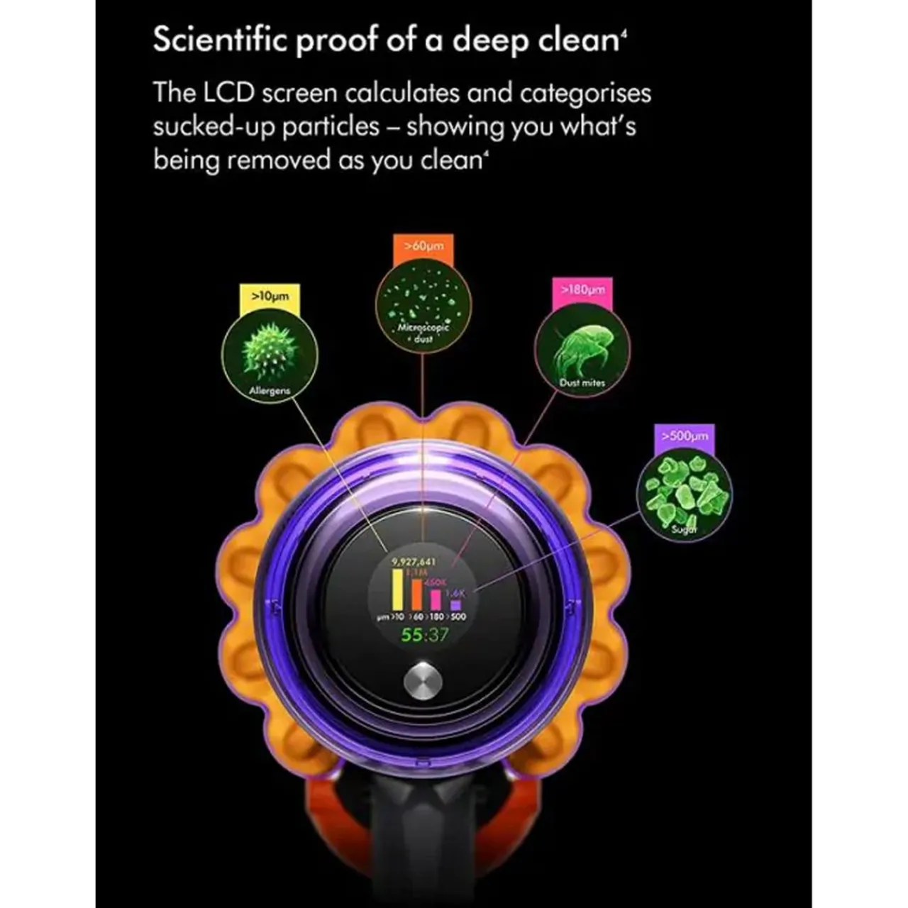 Scientific Proof of a Deep Clean: LCD screen calculates and categorises sucked-up particles – showing you what’s been removed as you clean.