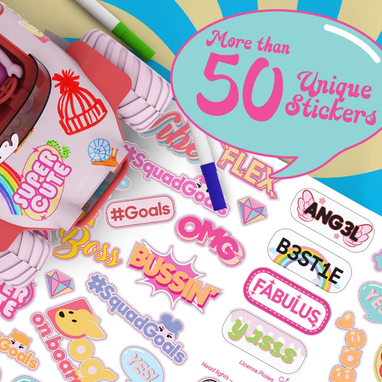 - This set includes: 1x vehicle, 1x remote control, 1x sticker sheet, 1x instruction manual, 2x extra wigs, 2x eyelashes, 4x marker pens