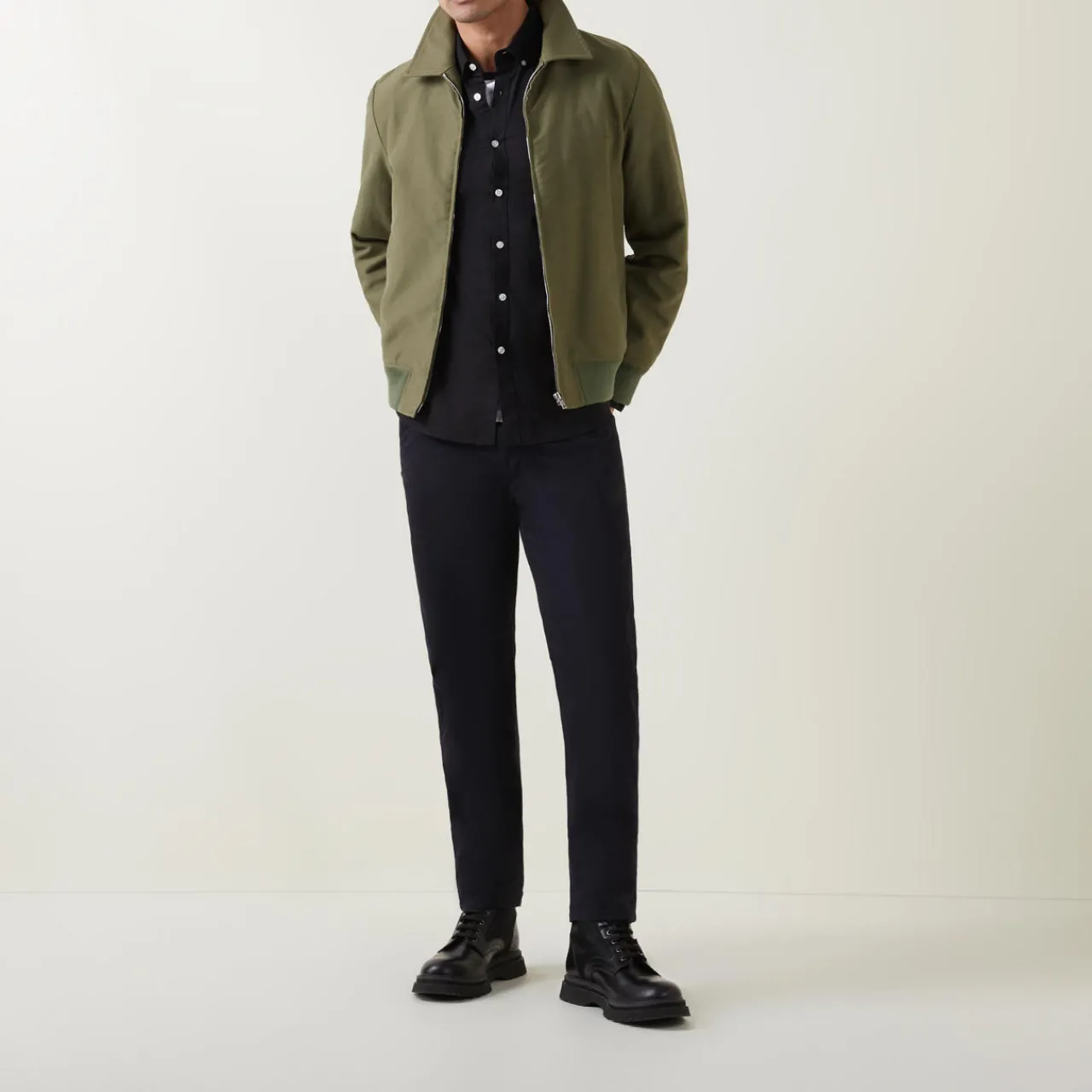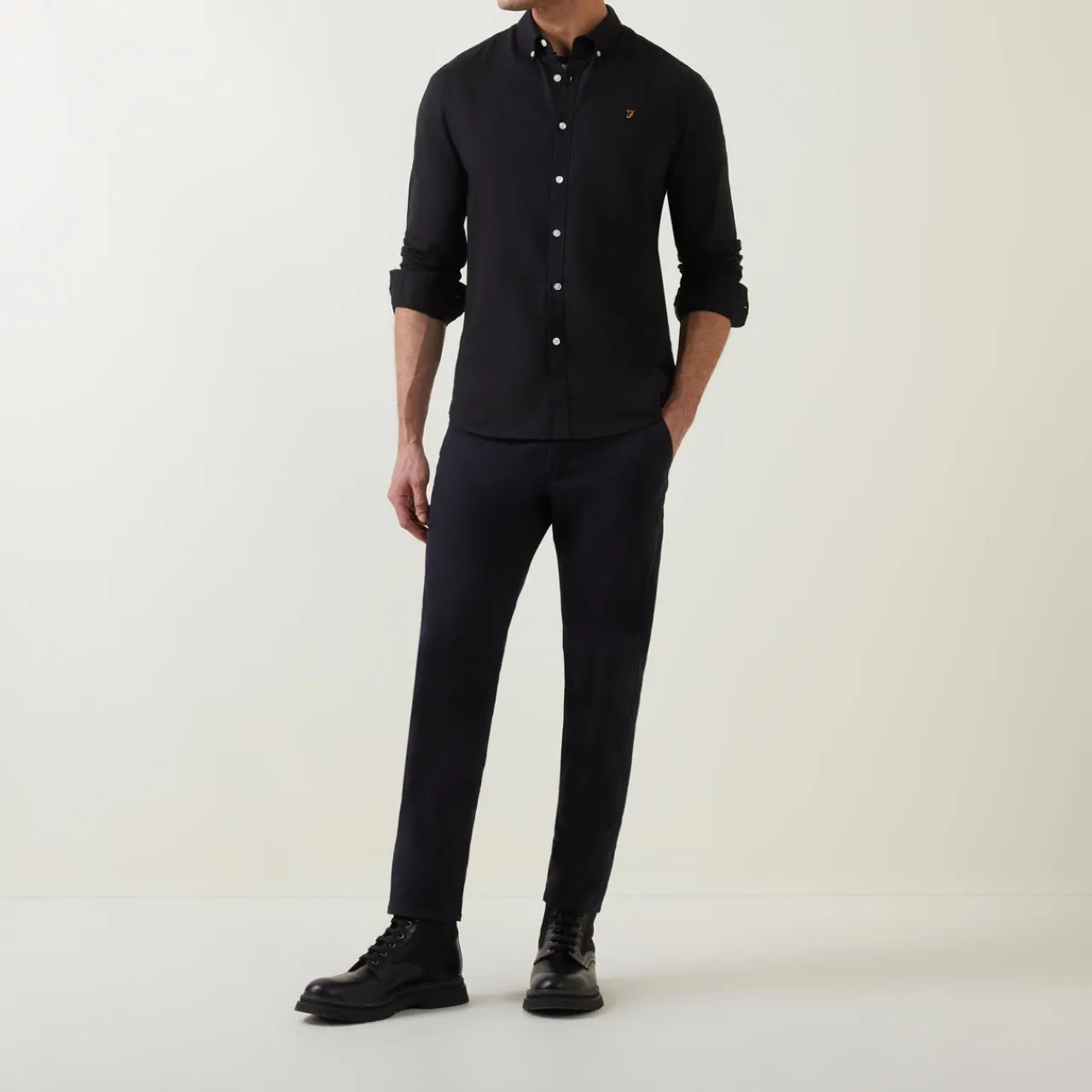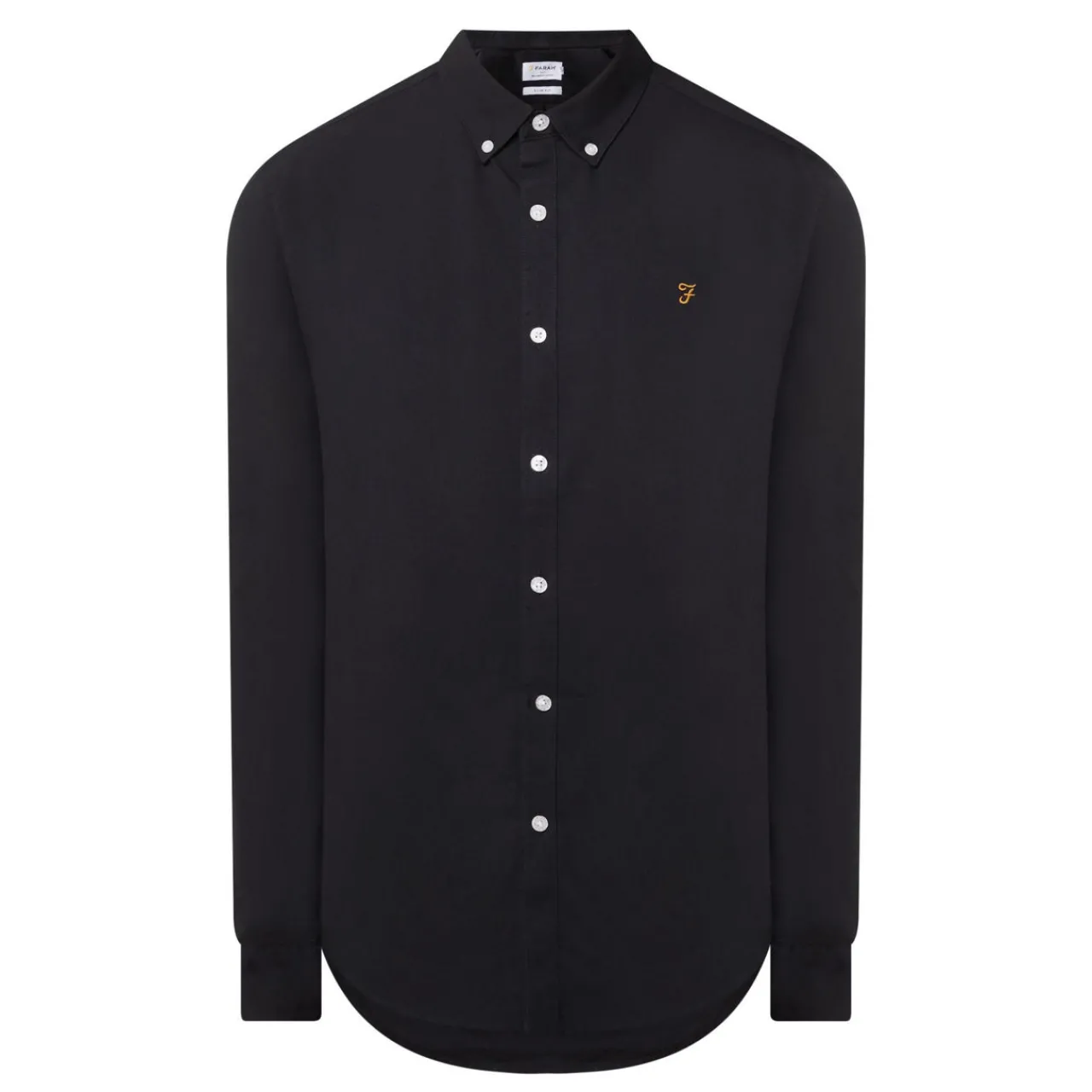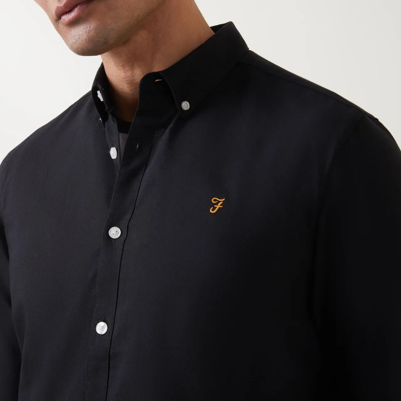 - Long sleeves, buttoned front, pointed collar, embroidered logo
