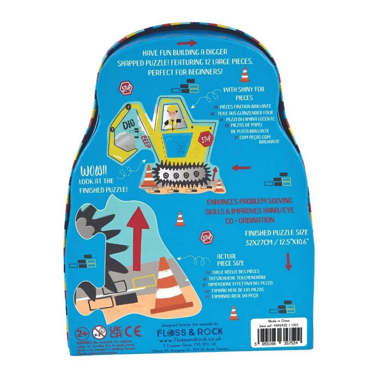 - 12 pieces, digger-shaped design, improves hand-eye coordination, improves cognitive and memory skills, foiling details, chunky puzzle pieces, reusable box
