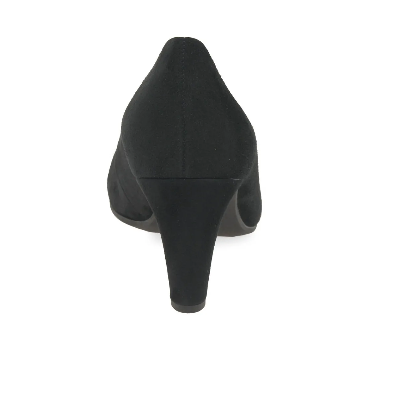 - Almond-shape toe, low vamp, slip-on style, stiletto heel, suede finish