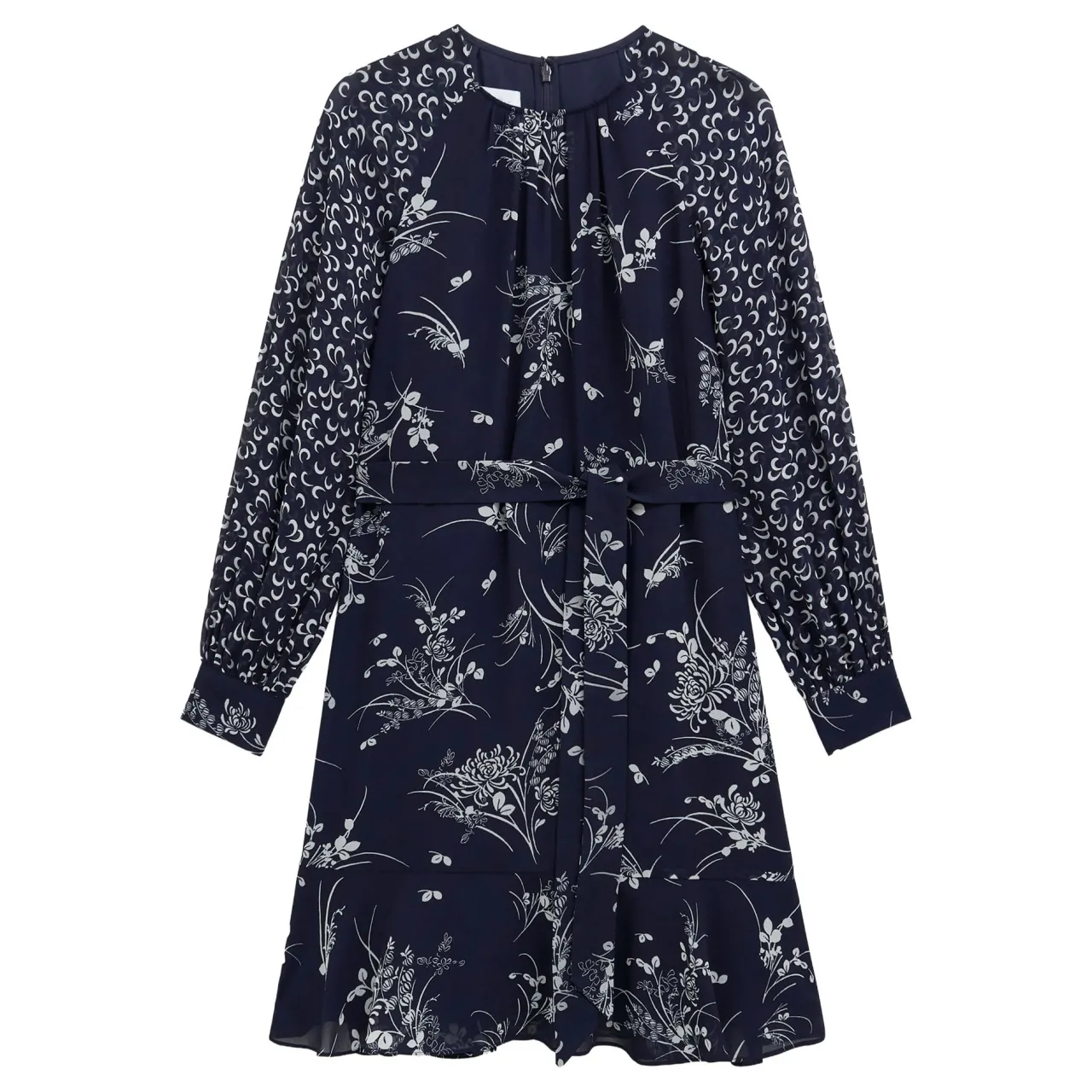 - Contrasting floral and celestial prints, sheer long blouson sleeves, tie-waist, peplum hem, gathered neckline, crew neckline, fit and flare silhouette, zip and hook fastening