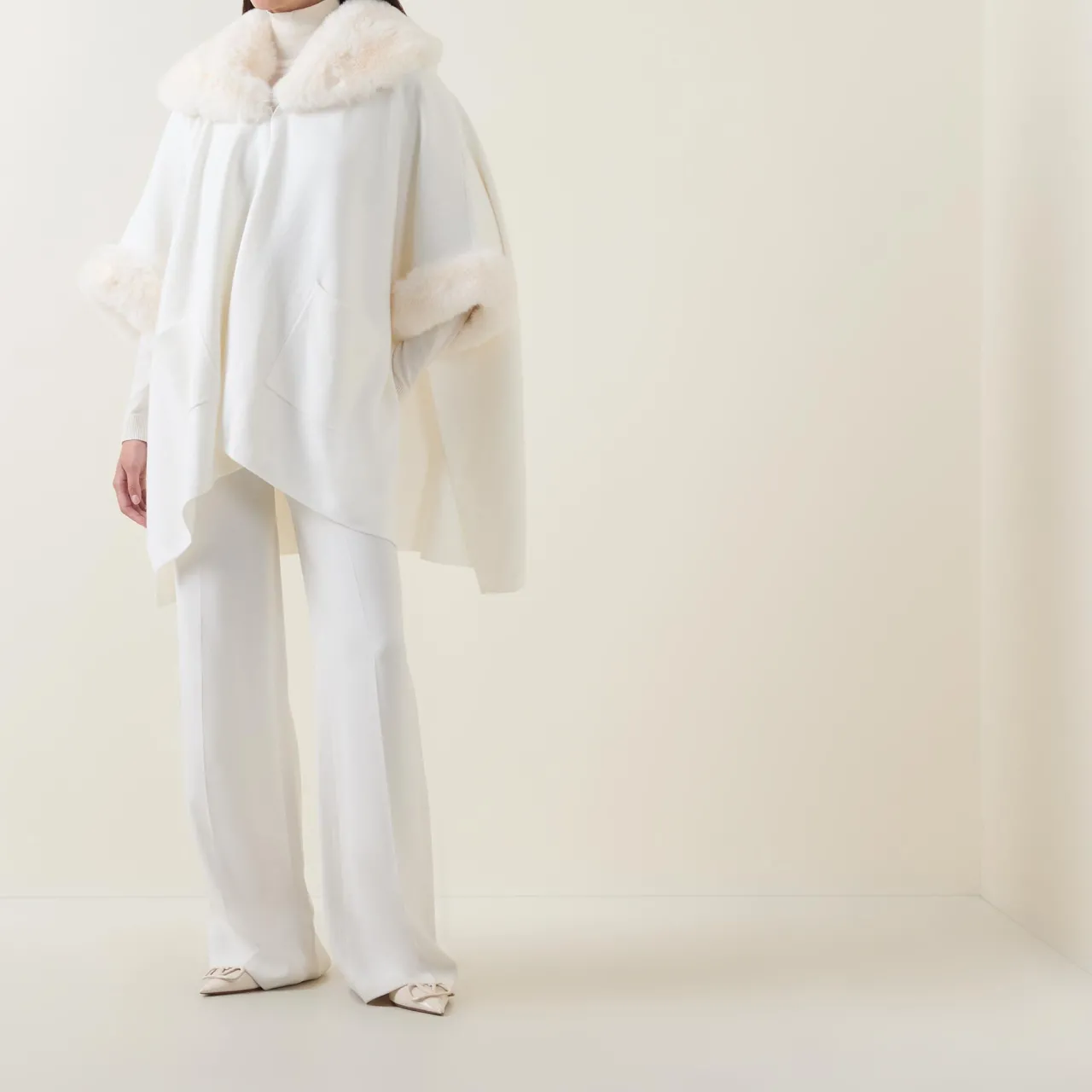 - Exaggerated shawl collar, three-quarter length sleeves, front zip fastening, two large patch pockets, asymmetric hem, faux fur trim detailing, soft finish