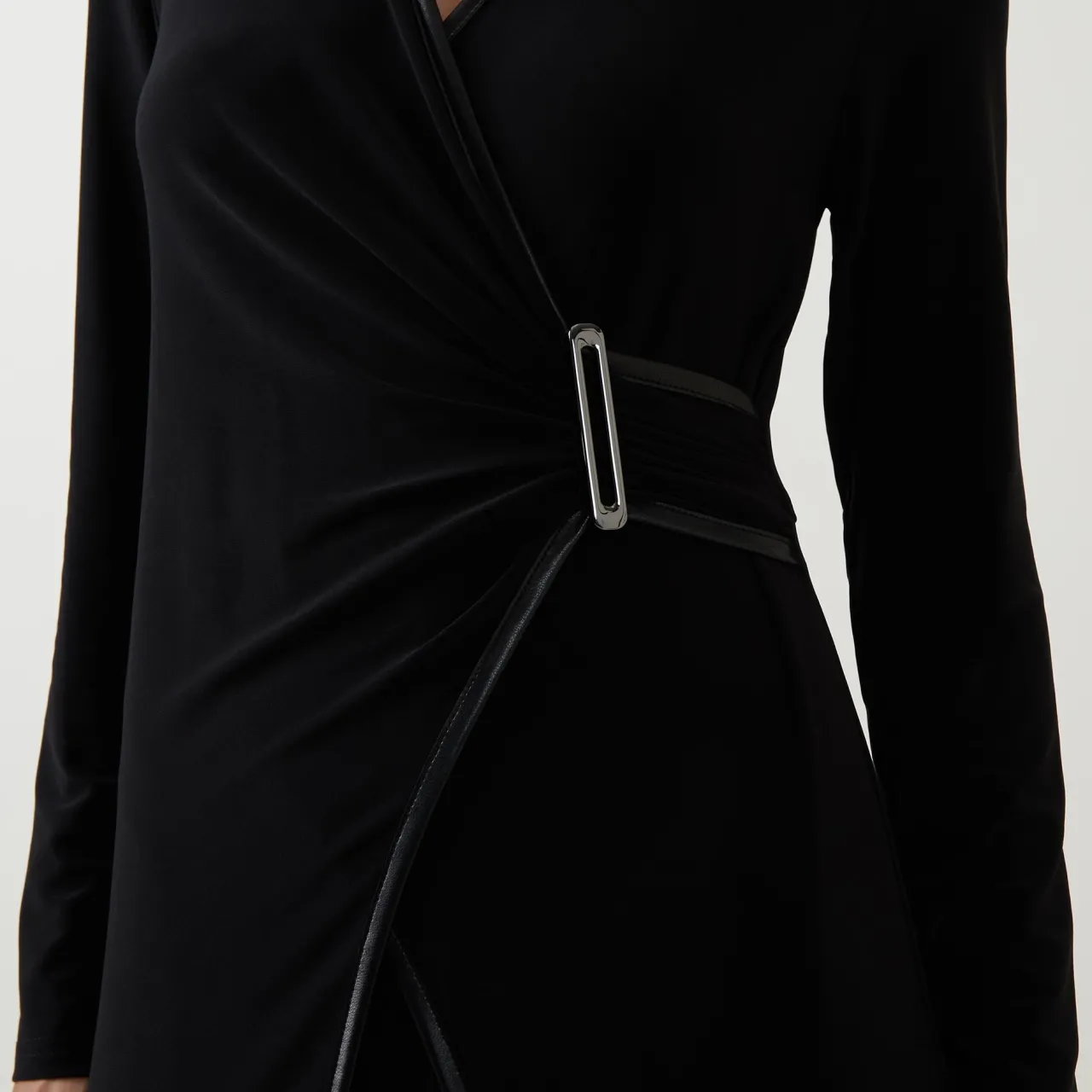 - V-neckline, long sleeves, wrap front, secured by a silver-tone clasp, wide-cut leg, smooth fabric