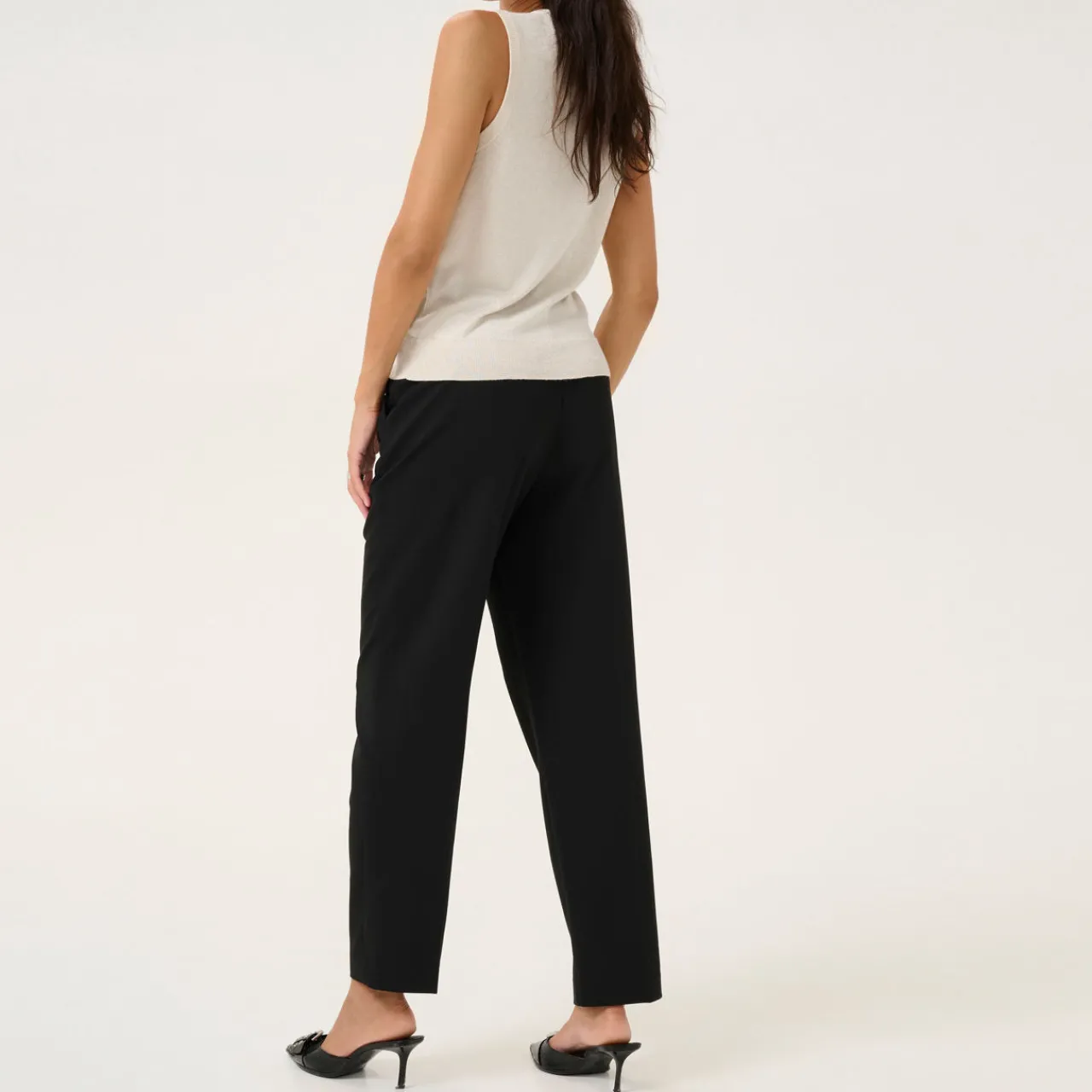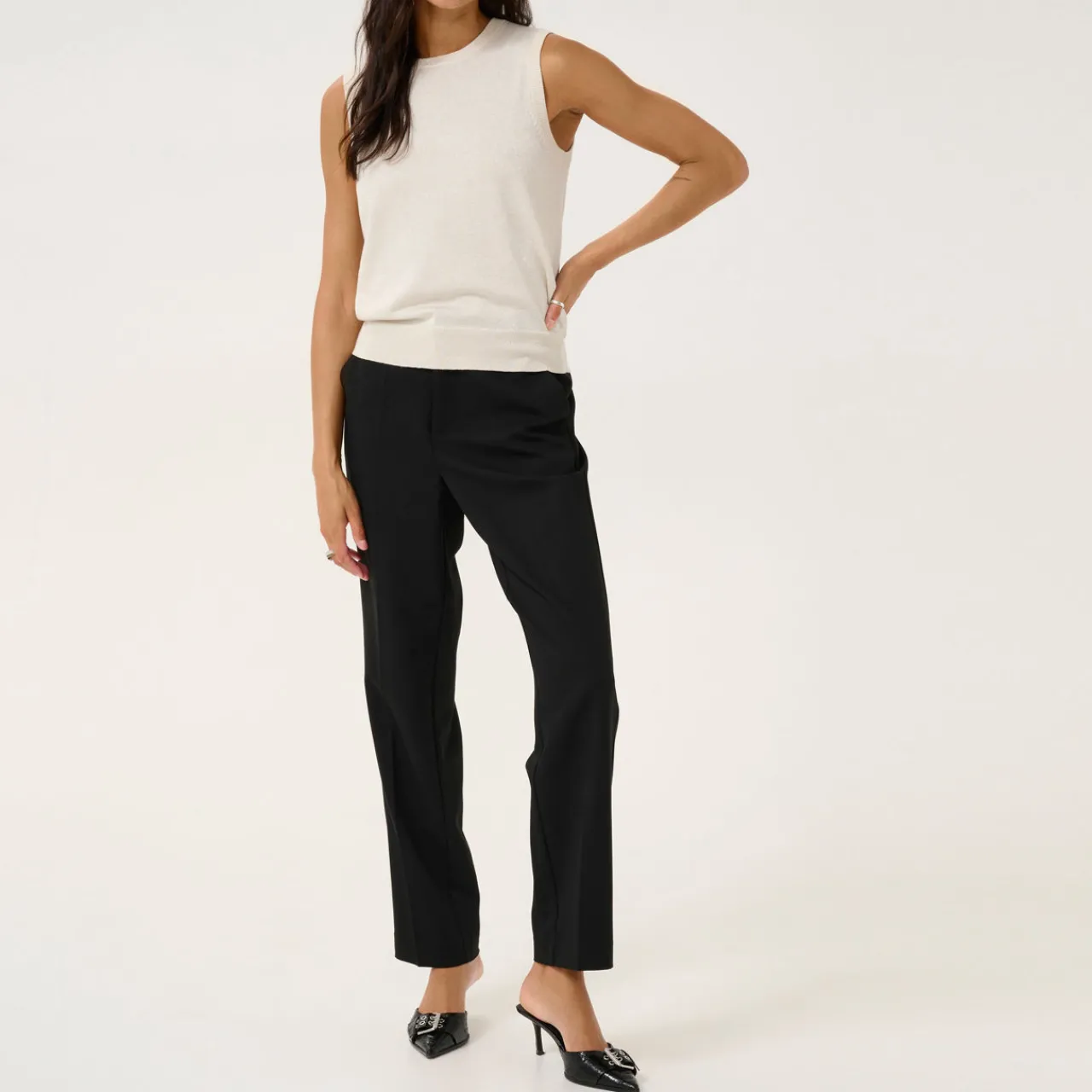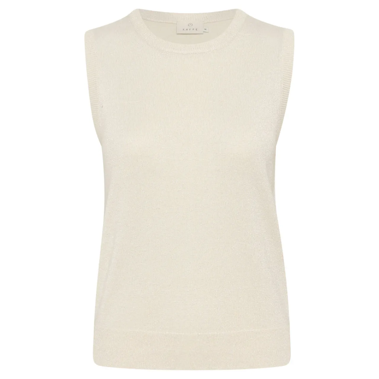 - Metallic knit fabric, shimmer finish, sleeveless, round neckline, wide shoulders, ribbed trims