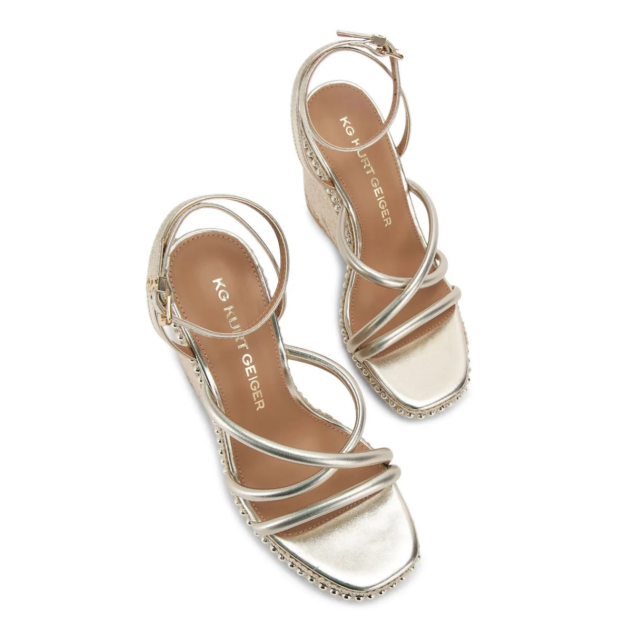 - Wedge heel, metallic gold-tone straps, rope-style base, gold-tone stud details