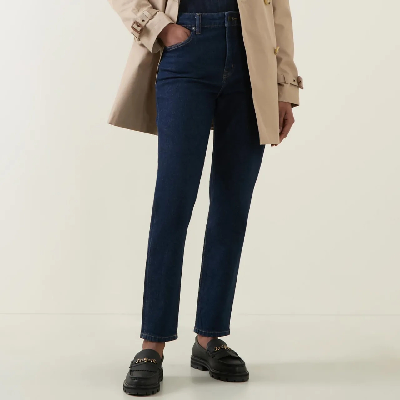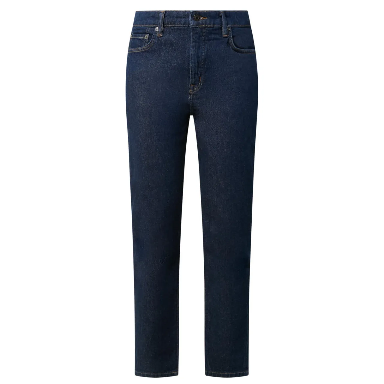 - Zip-fly and button fastening, belt loops, five-pocket design, contrast stitching, rear logo patch, high-rise, skinny-cut leg, turned-up cuffs, smooth denim finish