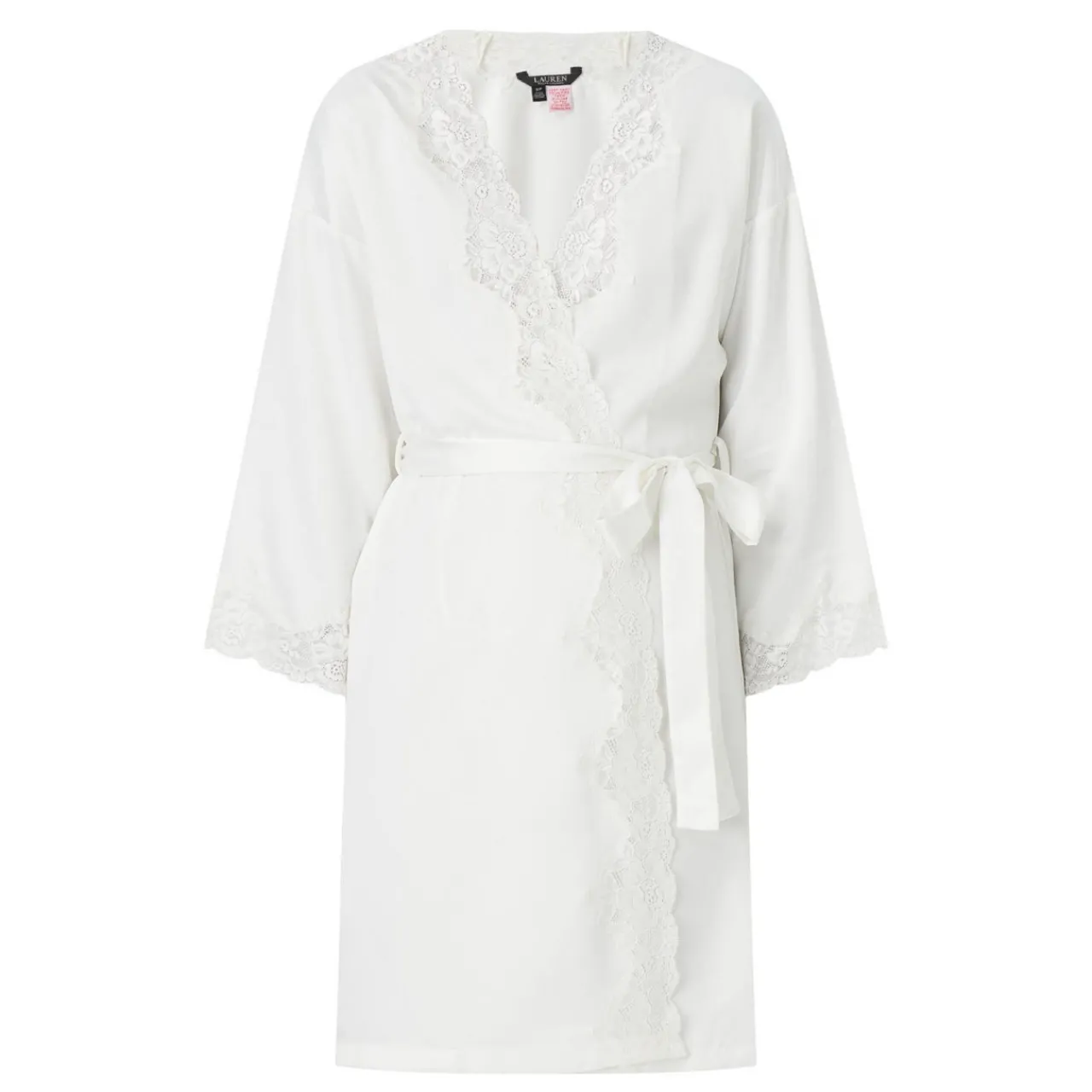 - Cropped sleeves, v-neckline, lace trim, waist belt.